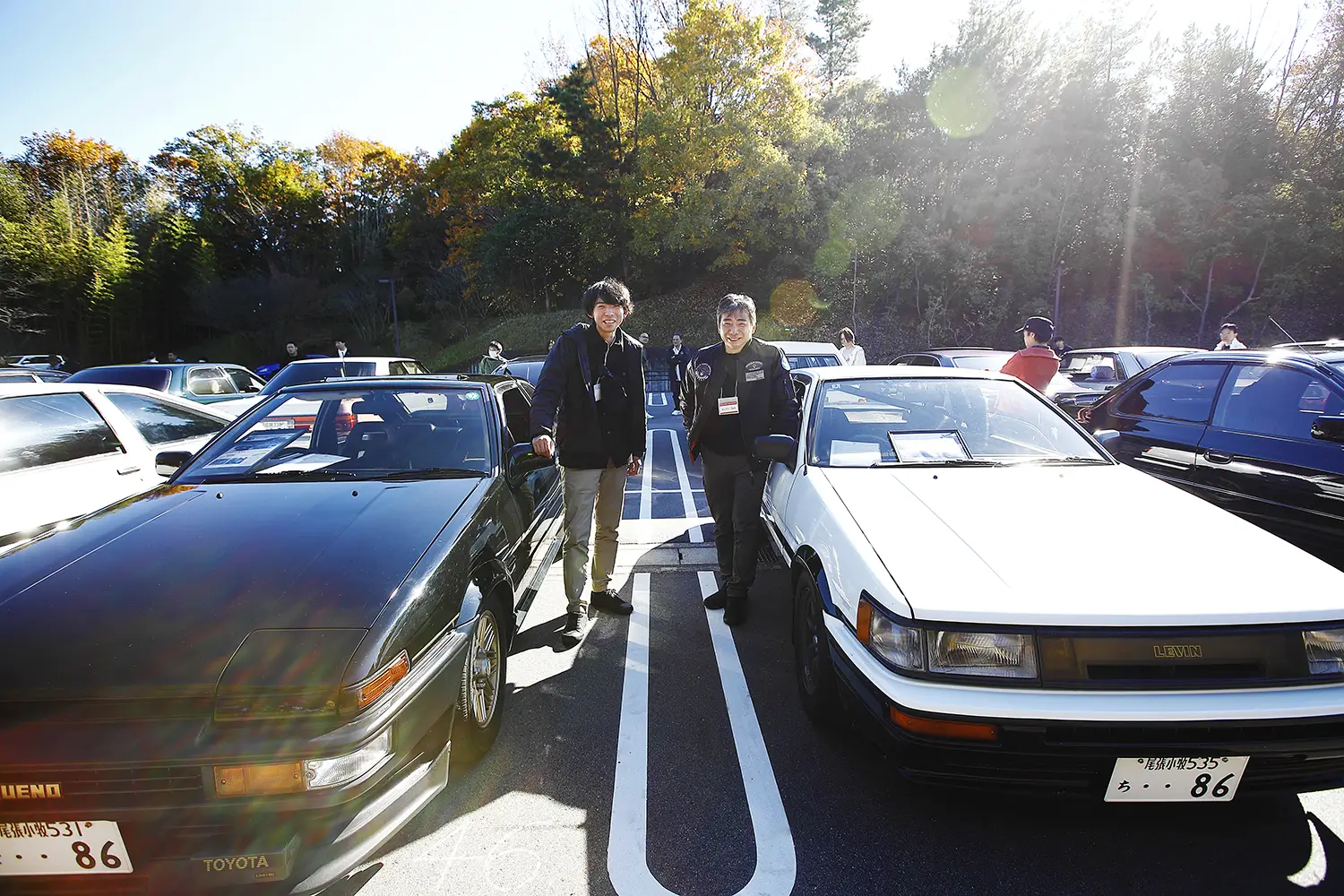 タカシマジュンさん・ユウキさん親子は、「ハチロク」の名で親しまれている1986年型の「カローラ レビン」と黒の「スプリンター トレノ」を駆り、ナンバーも2台揃って「86」。なんと、黒のトレノは息子のユウキさんが、「18歳で免許を取った日に父のジュンさんから譲り受けたもの」で、現在ジュンさんが乗る白のレビンは、「就職したユウキさんからプレゼントでもらったもの」なのだとか。