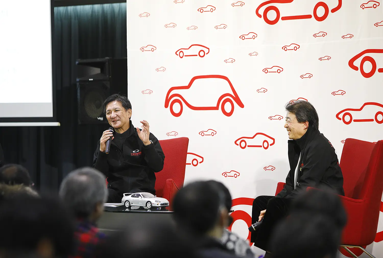 文化館1階ホールでは、トヨタのデザイン部門出身で第9代館長を務めた布垣直昭氏と、設計部門出身で第10代館長を務める榊原康裕氏による“新旧館長対談”も実施。1980~1990年代のクルマ開発の裏話や当時と現在の評価のギャップなど、ここでしか聞けないトークが繰り広げられました。事前に募集した質問に新旧館長が本音で答えるコーナーもあり、観客は熱心に耳を傾けていました。