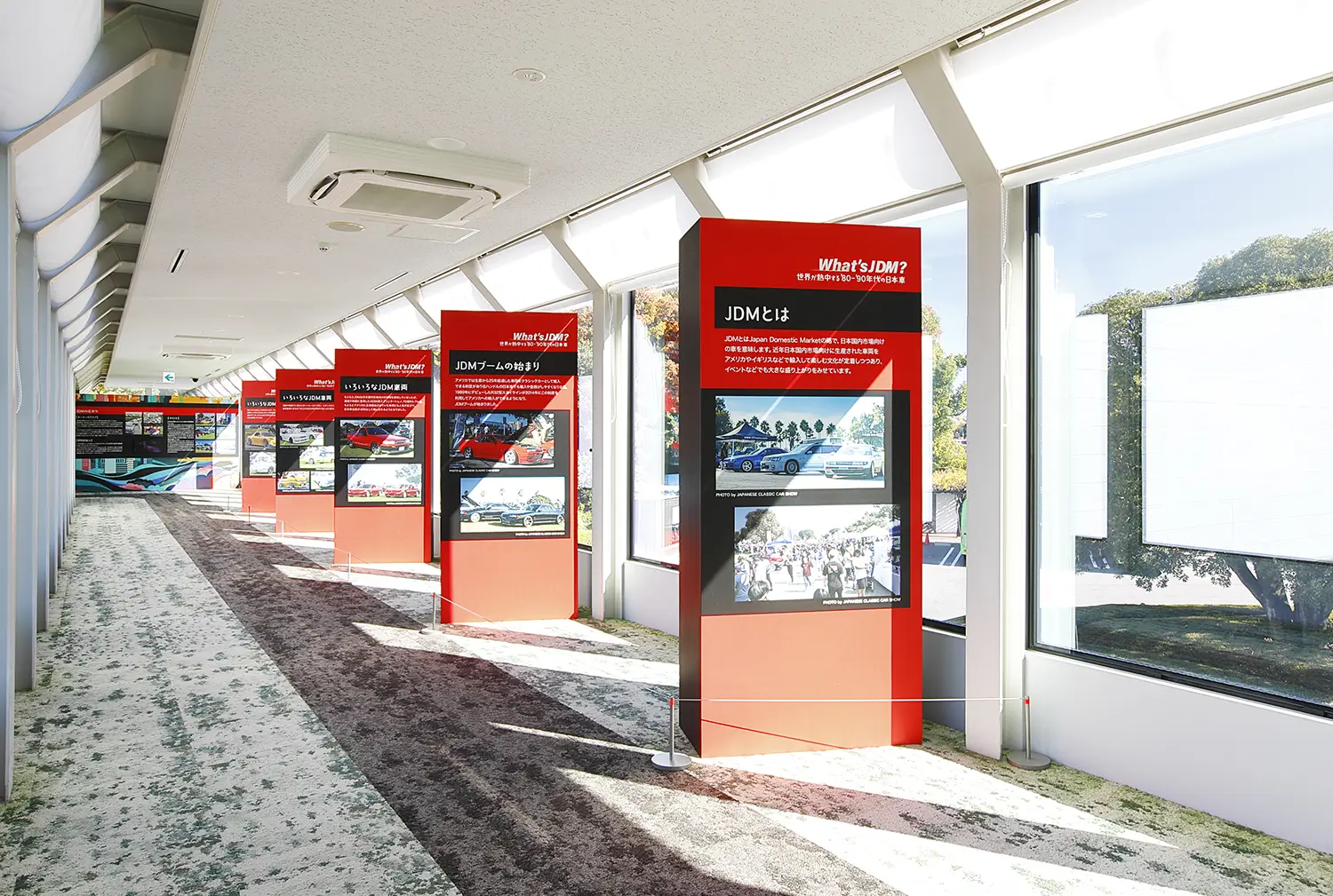 企画展は、「クルマ館」から「文化館」2階展示室へ向かう連絡通路のパネルからスタート。企画展のタイトルでもある「JDM」について、少し予習してから展示に進める構成となっており、クルマ好きはもちろん、詳しくない人でも楽しめる工夫が施されています。