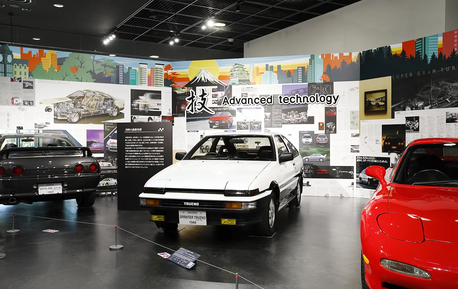 展示室には10台の日本車が放射状に配置。「スカイラインGT-R」と「スプリンター トレノ」は同館所蔵車、残る8台は国内メーカー各社や日本自動車博物館から借り受けたものとのことです。