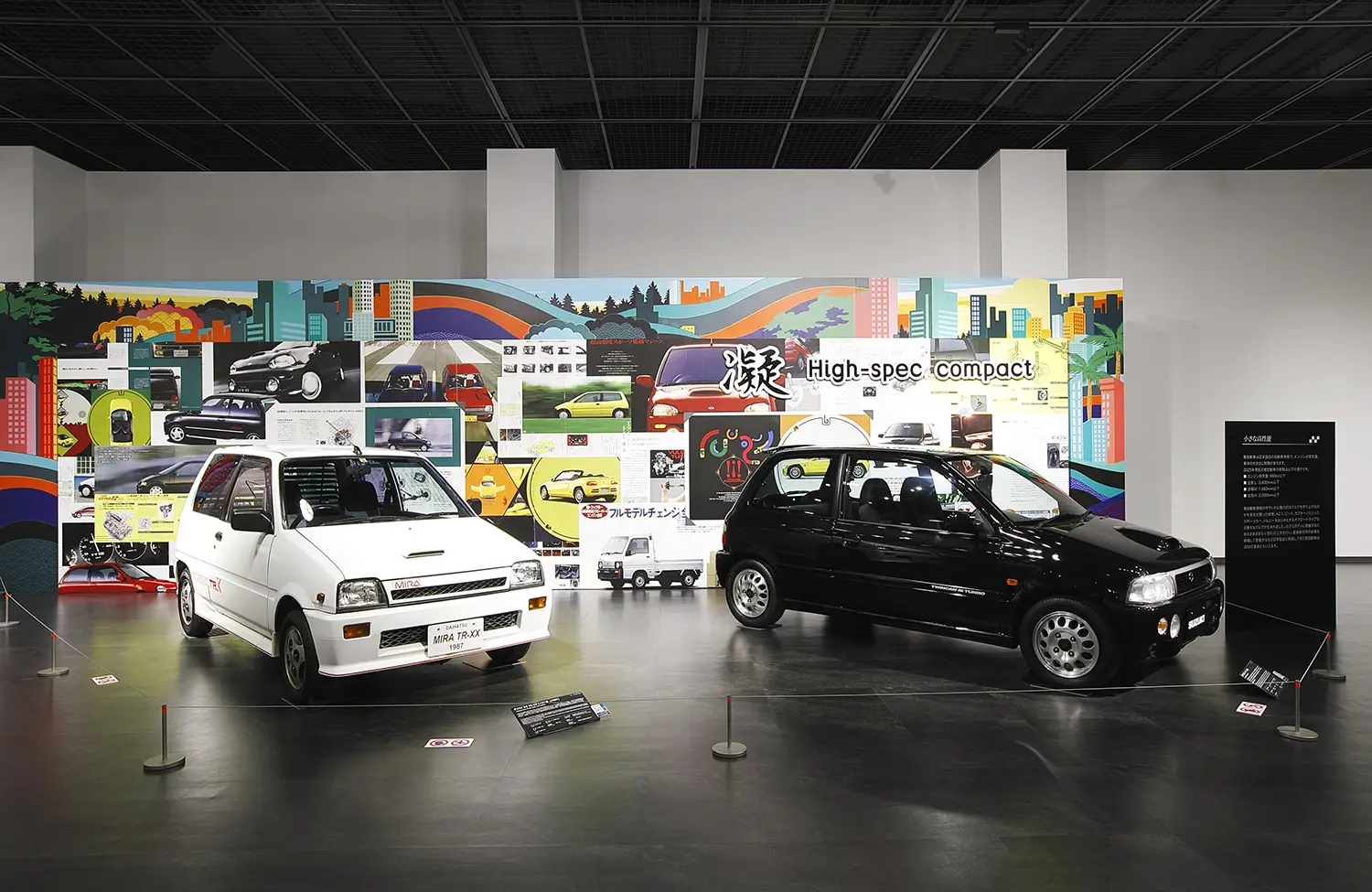 展示テーマは「当時の最新技術」「独自のデザイン」「小さな高性能」の3つ。壁面には当時のカタログを引用して時代ごとの技術革新やスタイリングの特徴がわかりやすく紹介され、BGMには『頭文字D』や『ワイルド・スピード』の映画で使用されていた楽曲を採用し、1980~1990年代の空気感を演出しています。
