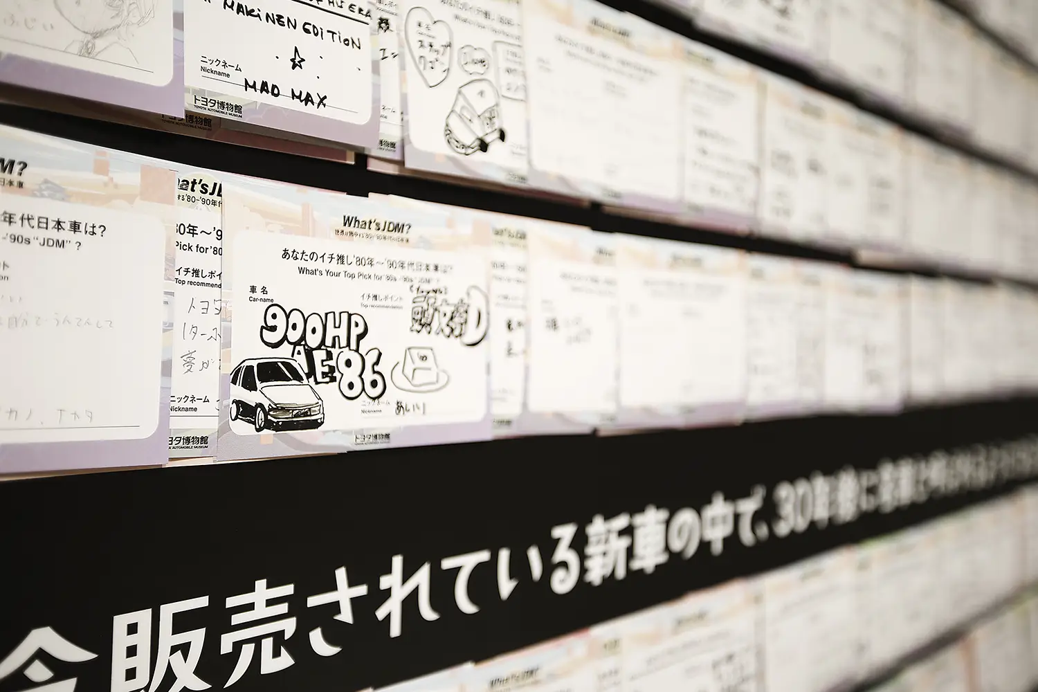 同館スタッフの岩澤光一郎氏によると、トヨタ博物館は来場者の約半数がインバウンドで、欧州系、アジア系がほぼ半々とのこと。本展でも海外来館者からの反応は大きく、会場奥に設置されたメッセージカードには外国語のコメントも数多く並んでいます。