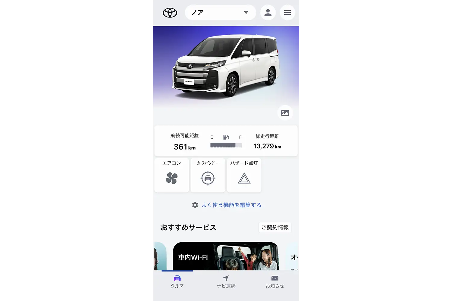 「T-Connect」を使ってクルマとスマートフォンを連動させるには「My TOYOTA+」というアプリのダウンロードと「TOYOTAアカウント」の取得が必要です。「T-Connect」の申し込み後に「My TOYOTA+」に「TOYOTAアカウント」でログインすると、所有しているクルマの車種や登録ナンバー、所有者名義などの情報がインプットされているのが確認できます。アプリのトップ画面には、所有しているクルマの画像とともに、ガソリン残量を示すメーター、航続可能距離、総走行距離などが表示されます。