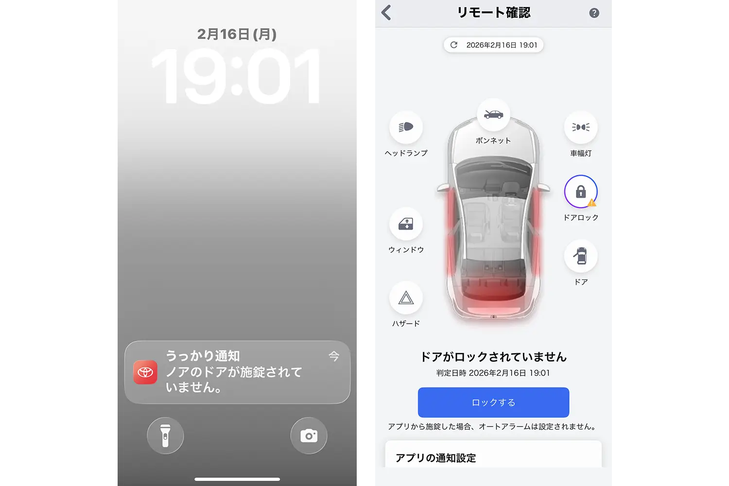 「My TOYOTA+」にはさまざまな機能がありますが、筆者がいちばん重宝しているのは、停車後のドアロックの施錠忘れやウィンドウの閉め忘れ、ハザードランプの消し忘れなどを知らせてくれる「うっかり通知」。アプリを立ち上げていなくてもスマートフォンにプッシュ通知されるほか、登録したメールアドレスにも通知メールが送られてきます。しかも、ただ知らせるだけでなく、アプリを通じて遠隔でロックしたりウィンドウを閉めたりすることもできるので、わざわざクルマまで戻らなくていいのがとても便利です。