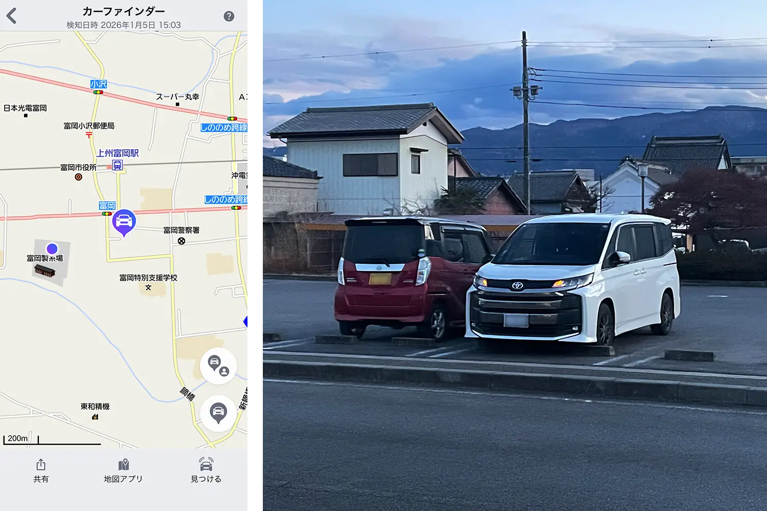 観光地に行くと、駐車場が離れていることがよくあります。観光を終えて帰ろうと思ったら、方向感覚がわからなくて駐車場がどこにあるのかわからないなんていうことがありがちです。そんなときに役立つのが「カーファインダー」です。これをタップすると、自分がいる位置とクルマの所在地を地図上に示してくれるので、帰りに迷う心配がありません。近くにいるのにクルマが見つからない場合は、ハザードランプを点滅させることもできます。万一盗難にあった際でも、発見できる可能性を高めてくれます。