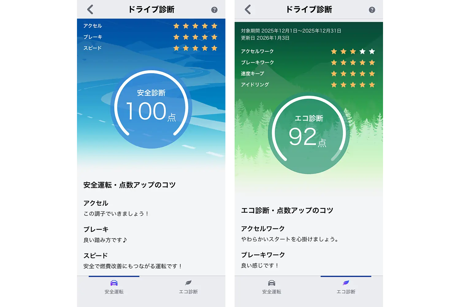 エコ診断も可能で、アクセルワーク、ブレーキワーク、速度キープ、アイドリングの4項目を五つ星で評価し、スコアを提示。改善のためのアドバイスもしてくれます。