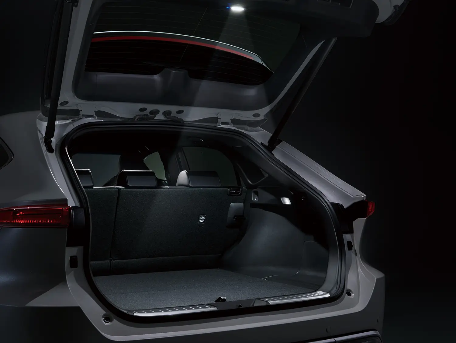 ほかにも、実用面で便利なカスタムパーツとしてあるのが「ラゲージLED」。これを装着すると、バックドアの開閉と連動して光るLEDが足元を明るく照らし、夜間の荷物の積み下ろし作業をより安全かつスムーズなものに整えてくれます。