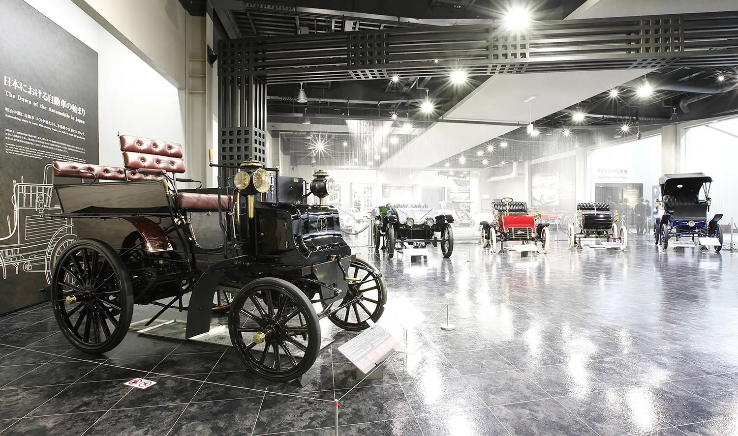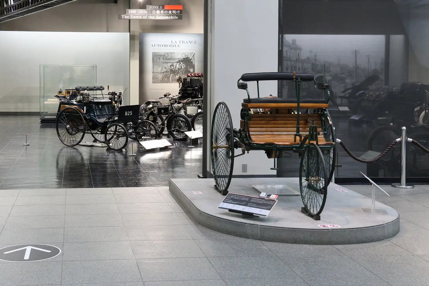 クルマ館2階のテーマは「自動車の黎明期から日本車の誕生」。ドイツで生まれた世界初の実用的なガソリン自動車とされる「ベンツ パテント モトールヴァーゲン(レプリカ)」(1886年)を起点に、1950年代までの世界の自動車技術・文化の歴史が8つのゾーンで紹介されています。