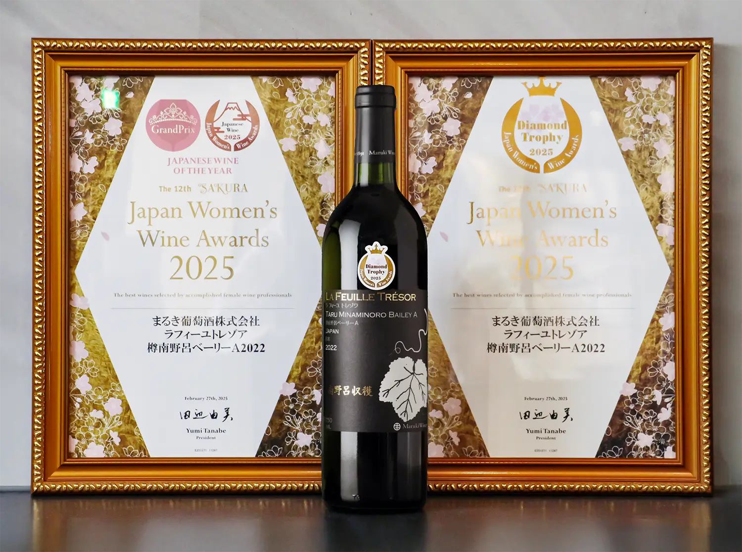 これらのワインのクオリティの高さは、もちろん世界でもトップレベル。2025年2月に開催されたアジア最大のワインコンペティション「サクラアワード」で、まるきワイナリーの「ラフィーユ トレゾワ 樽南野呂ベーリーA 2022」と「いろ甲州 2024」が最高賞のダイヤモンドトロフィーでダブル受賞を果たしました。今回は36カ国・約4,000アイテムがエントリーし、その中からダイヤモンドトロフィーに選ばれたのはわずか64本。しかも64本中、日本産は4本のみだったそうで、まるきワイナリーの実力を改めて国内外に示すことになったのです。