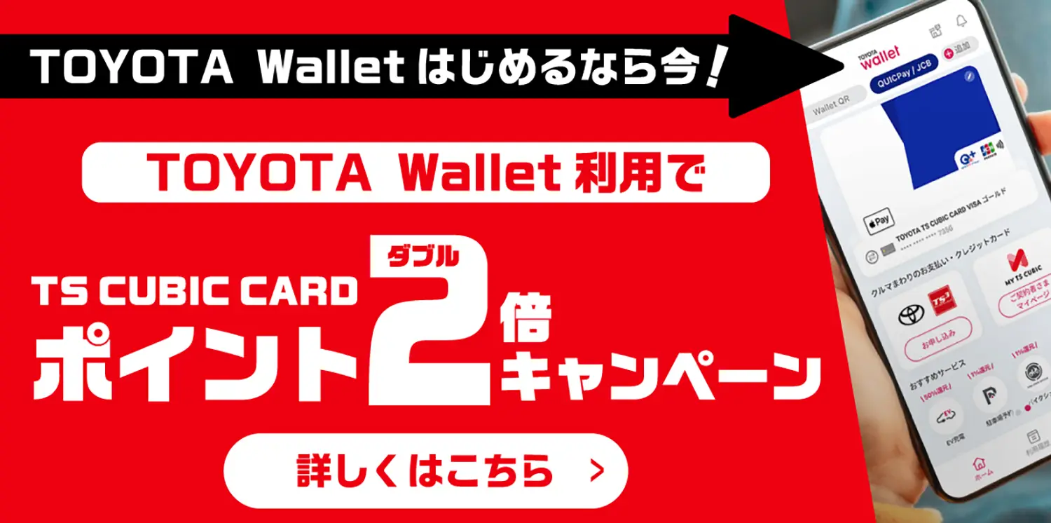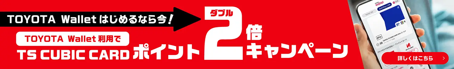 現在、ポイントが通常の1%から2%にアップする〝ポイントダブルキャンペーン〞を実施中。TS CUBIC CARDをお持ちの方が、そのカードからTOYOTA Walletにチャージして使うだけで、2%分のポイントが付与される。日常のお買い物などをそのままTOYOTA Walletに置き換えるだけで、効率よくポイントがたまり、結果的に大きなメリットにつながっていく。