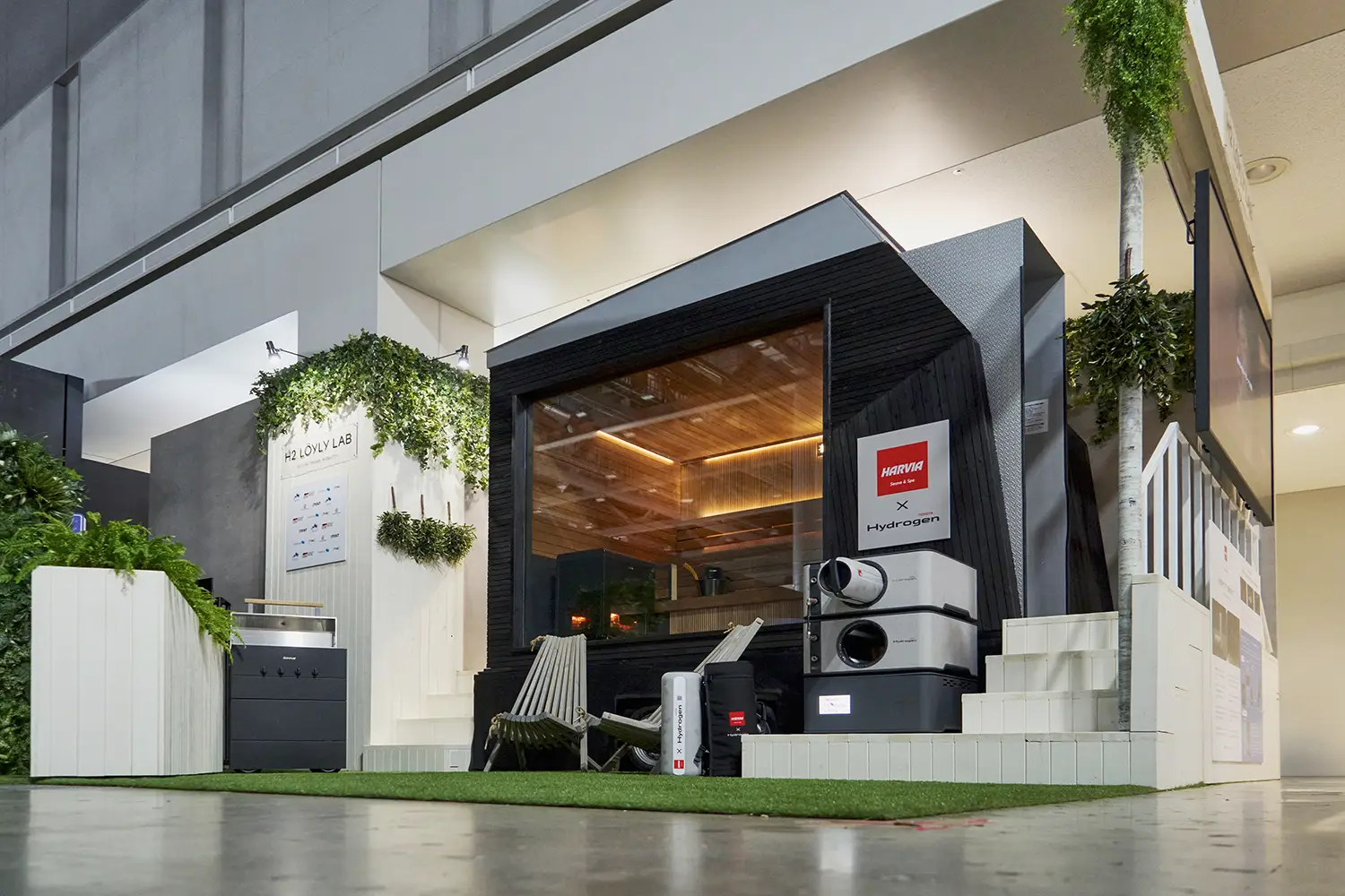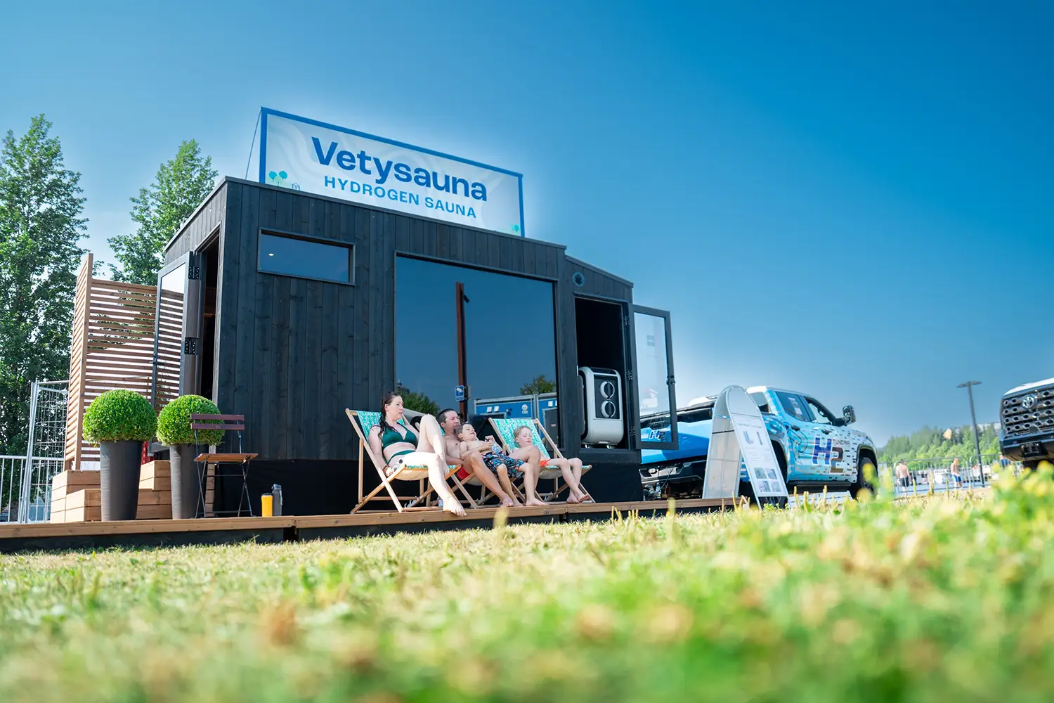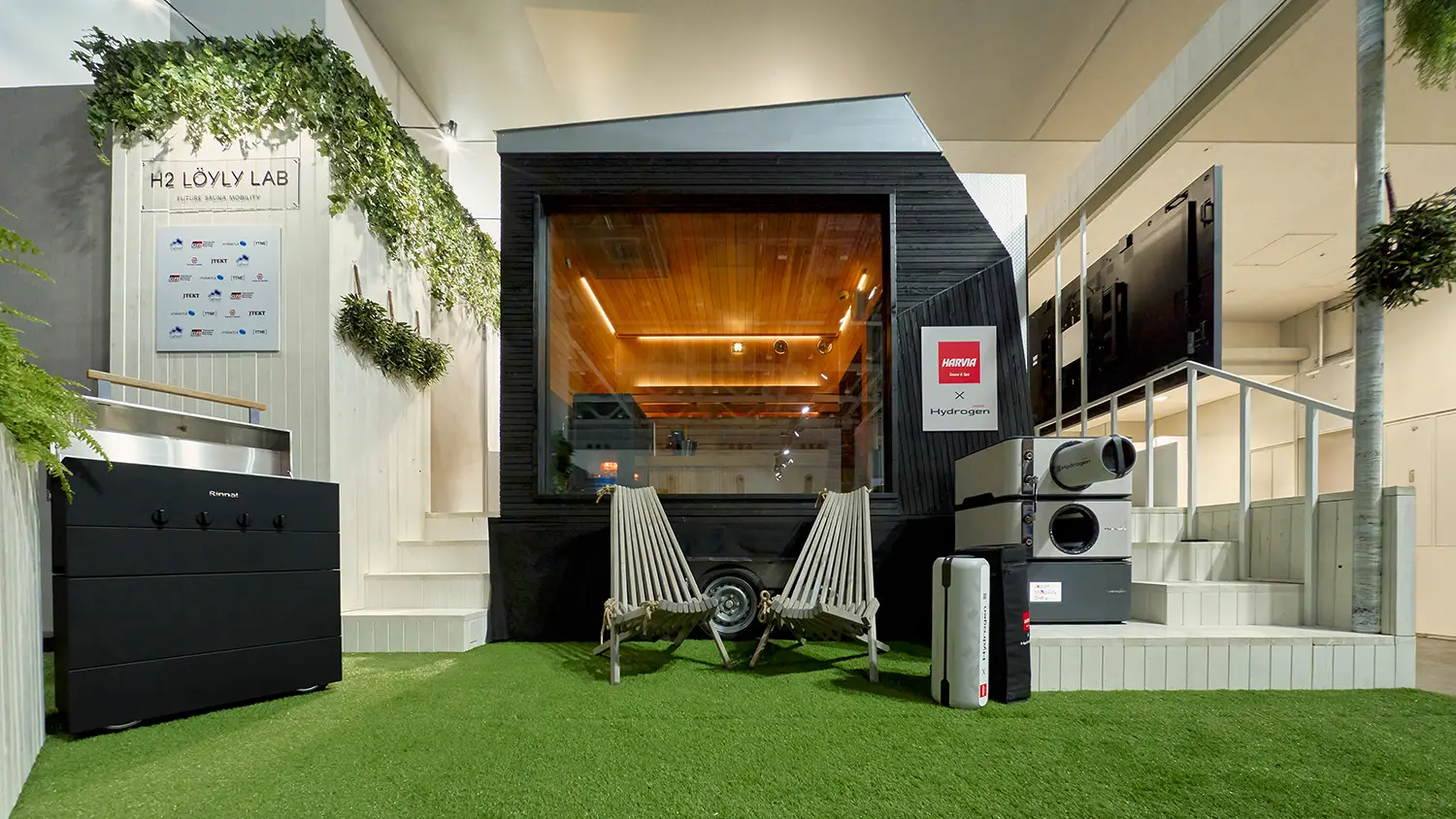 黒くてモダンな、トレーラーハウスのようなボックス。扉を開けると、中には石を載せたストーブが据えられ、木製の長椅子が整然と備え付けられています。ひと目でサウナルームだと分かる空間です。けれど、これはただのサウナではありません。フィンランドの大手サウナメーカー「ハルビア」とトヨタが共同開発を進めている「水素サウナ」なのです。