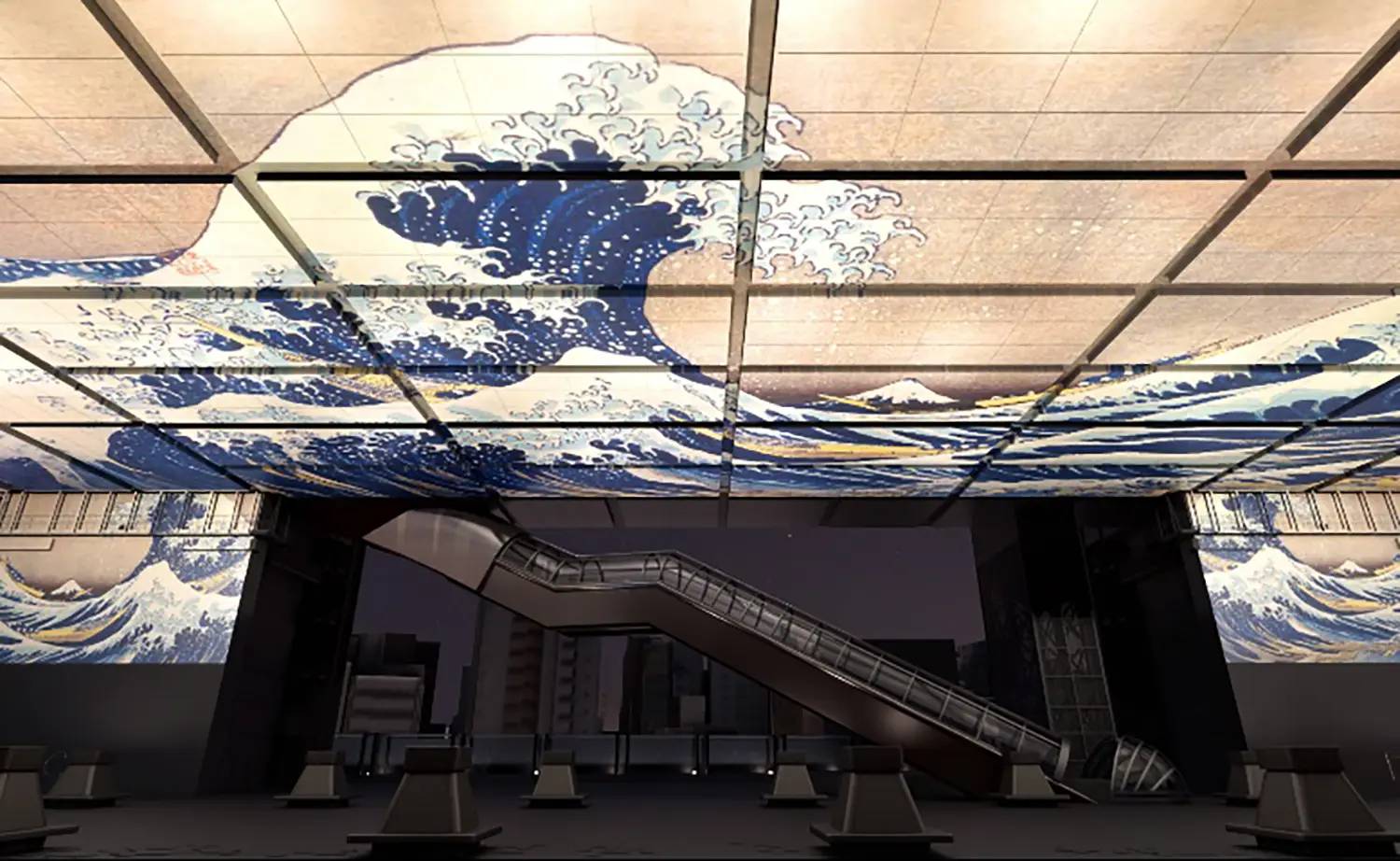 注目すべきは、3階に広がる約4,000平方メートルの大空間です。天井面や柱面に、葛飾北斎や歌川広重が描いた浮世絵などの収蔵品資料や、江戸・東京の街の風景を投影し、建築と映像が融合した没入型の鑑賞体験を実現します。