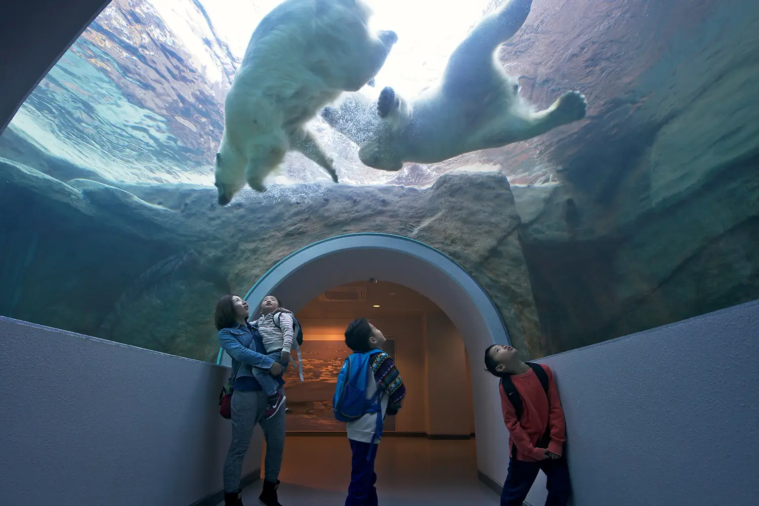 園内で特に注目したいのが、「猛獣館299」の水中トンネル。下から見上げると、ホッキョクグマが水中を悠々と泳ぐ様子を間近に観察でき、その大きさと優雅さに圧倒されます。旭川市旭山動物園で一躍有名になった行動展示の魅力を、こちらでも体感することができます。