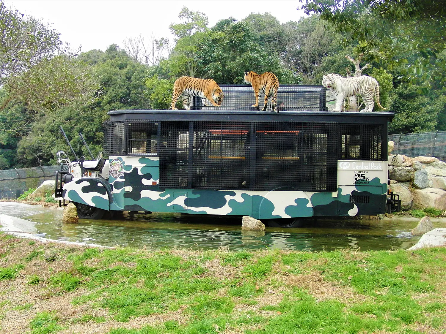 兵庫県姫路市にある大型レジャー施設。最大の魅力は、なんといってもマイカーでそのまま巡ることができる「ドライブスルーサファリ」です。上や横からライオンたちが迫る「サファリ・ザ・ライド」も人気で、猛獣たちと間近で向き合うダイナミックな体験は、忘れられない記憶として心に刻まれることでしょう。