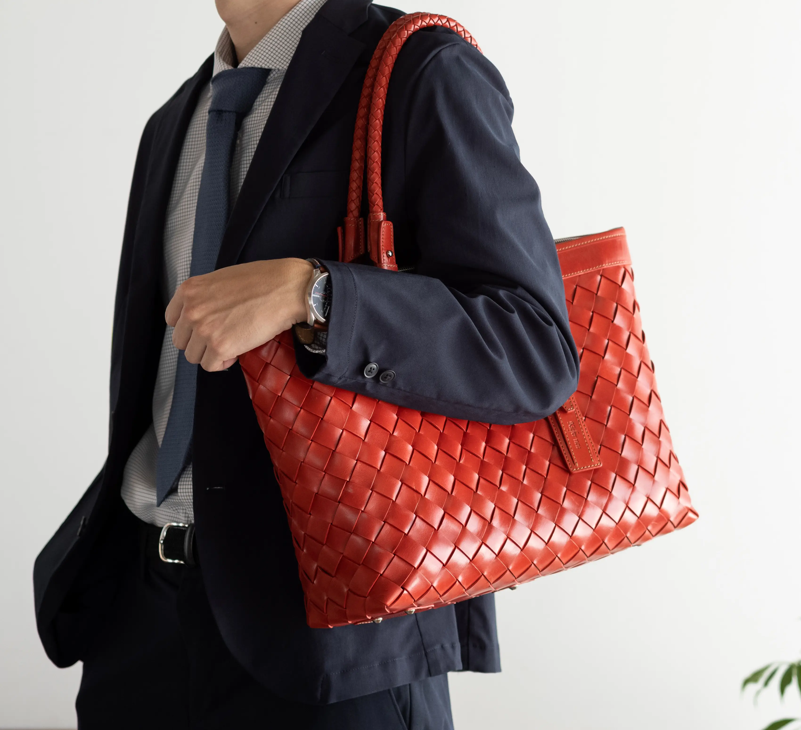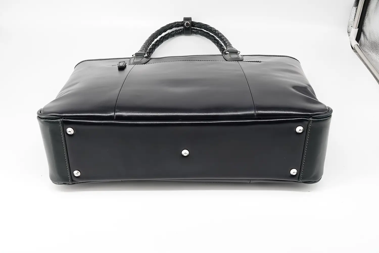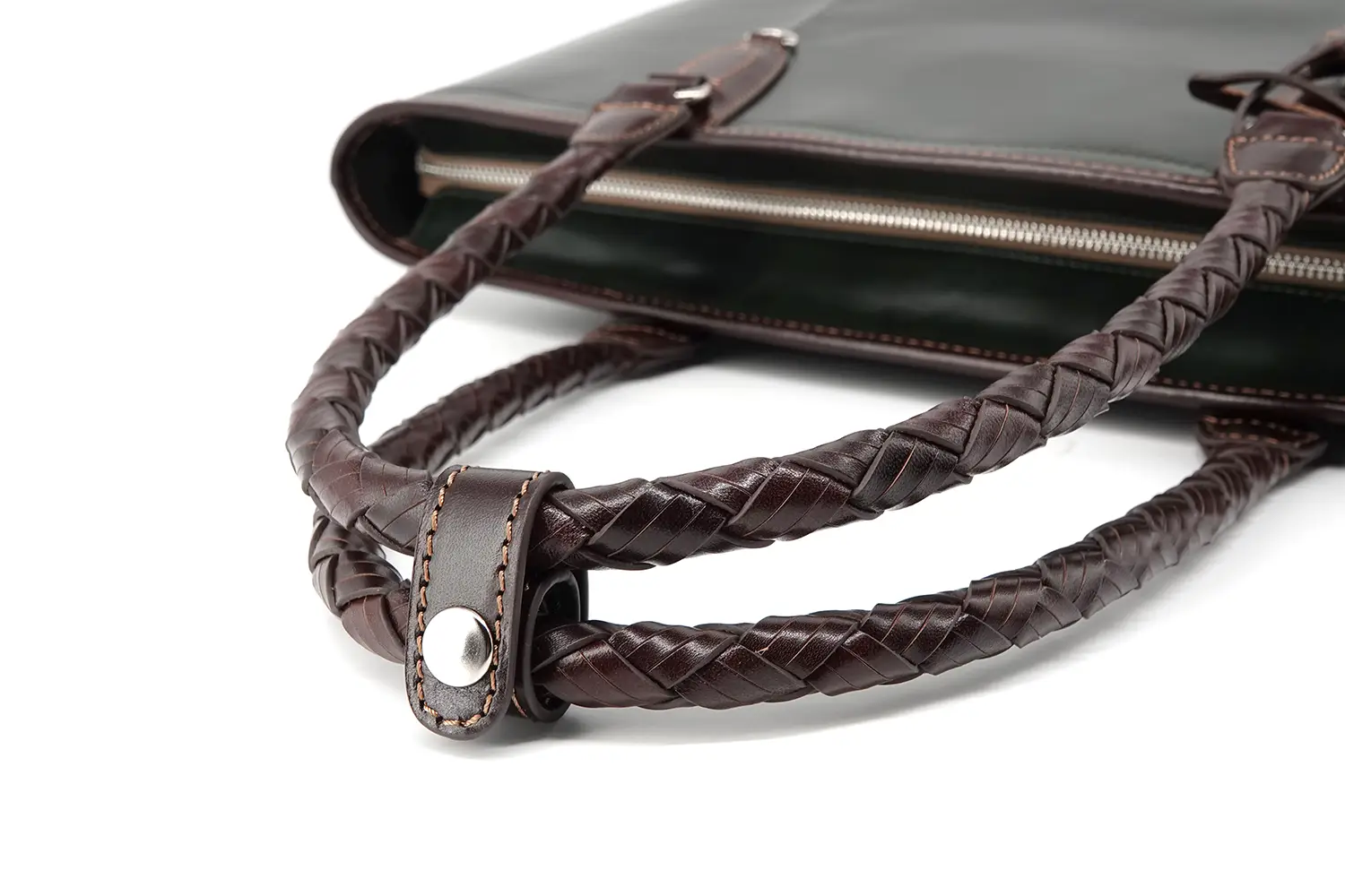 レザーの編み込みハンドルをはじめ、自立する堅牢さと柔らかな趣を両立させた芯材の配置など、細部にまで配慮が行き届いています。そのたたずまいは無骨なビジネスバッグというより、繊細で品格のある女性用ハンドバッグに通じるものづくりといえるかもしれません。