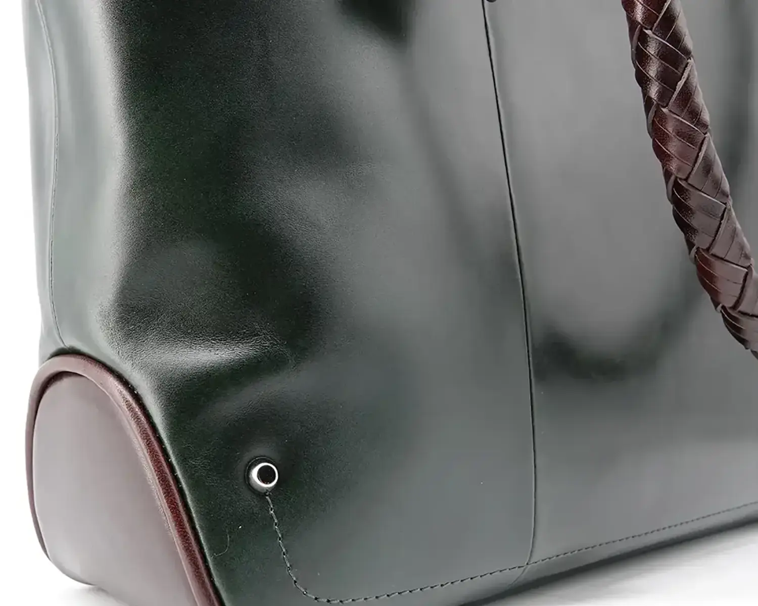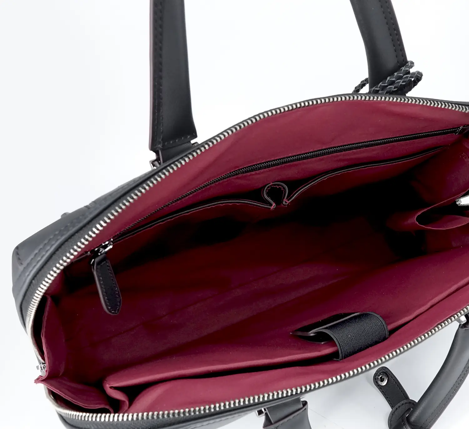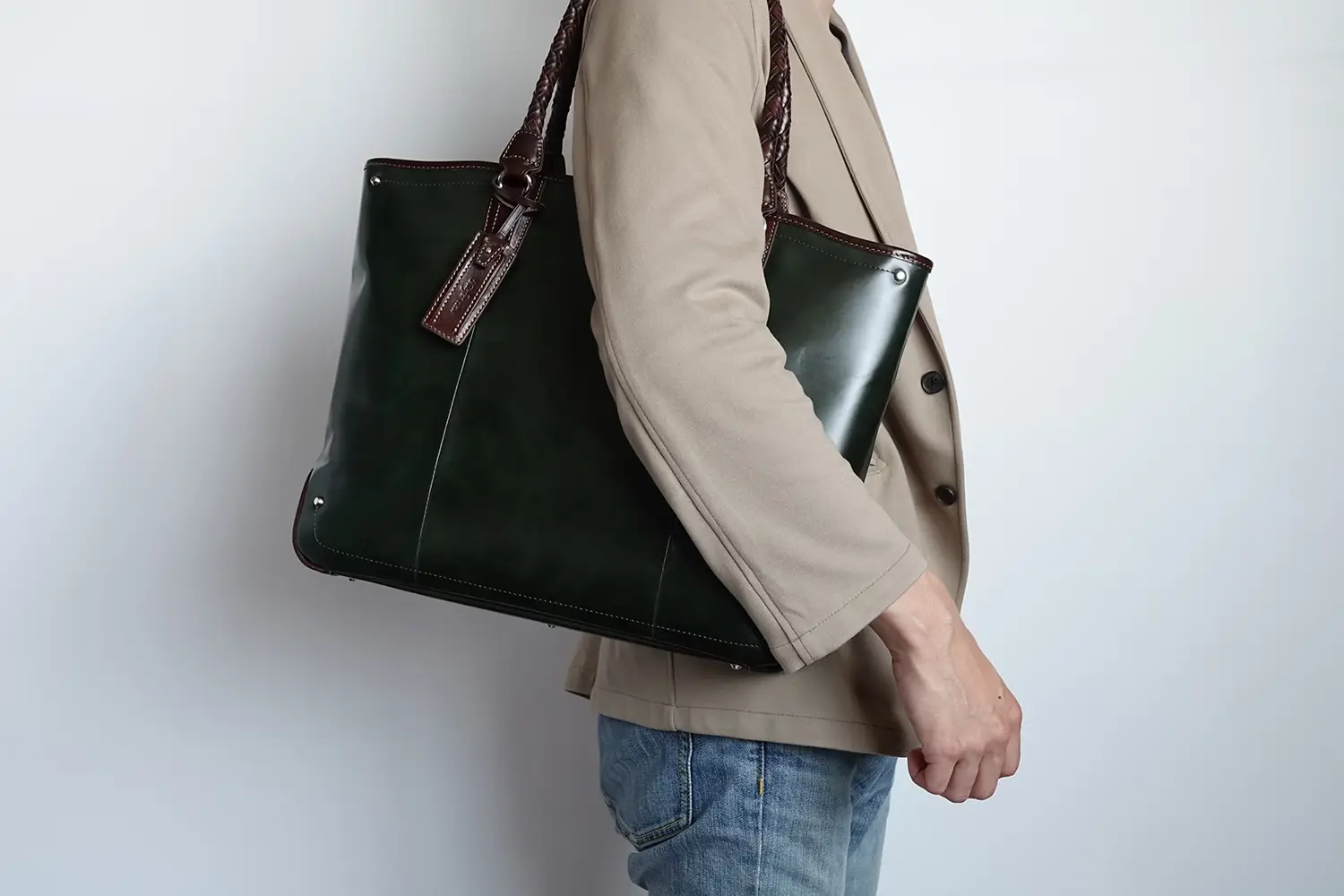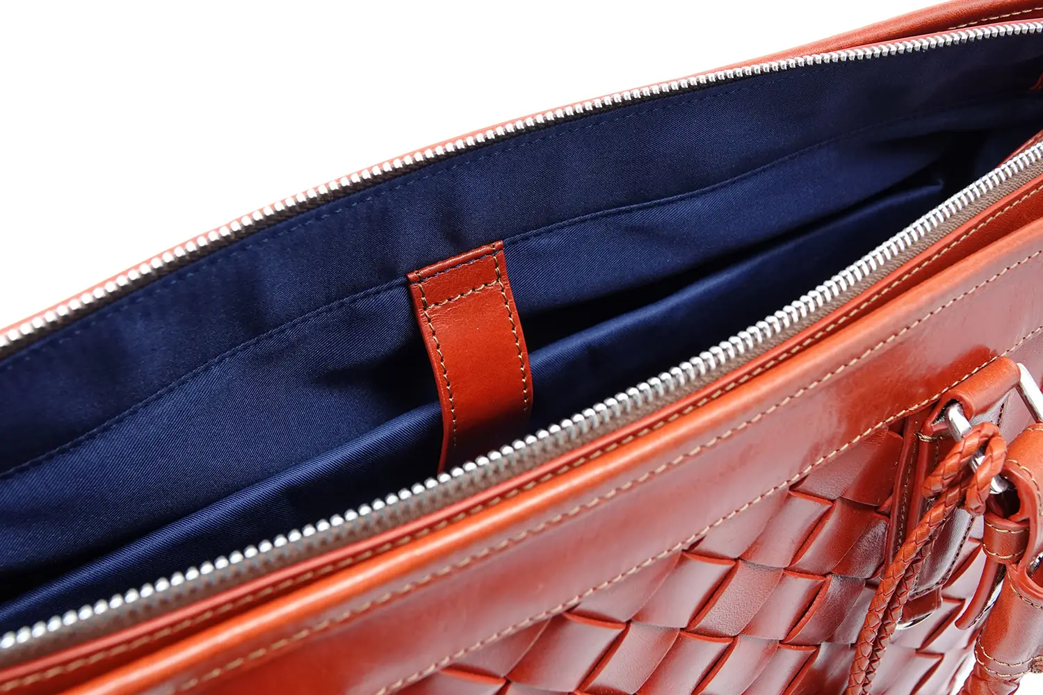 レザーの編み込みハンドルをはじめ、自立する堅牢さと柔らかな趣を両立させた芯材の配置など、細部にまで配慮が行き届いています。そのたたずまいは無骨なビジネスバッグというより、繊細で品格のある女性用ハンドバッグに通じるものづくりといえるかもしれません。