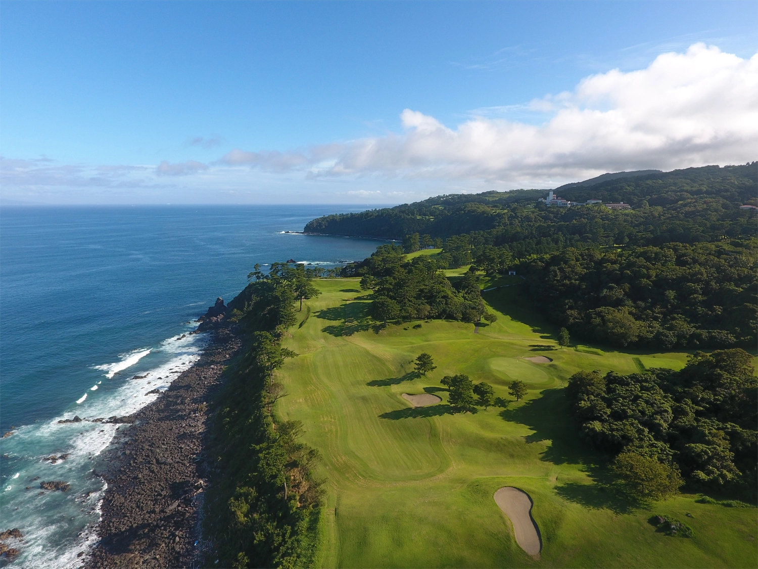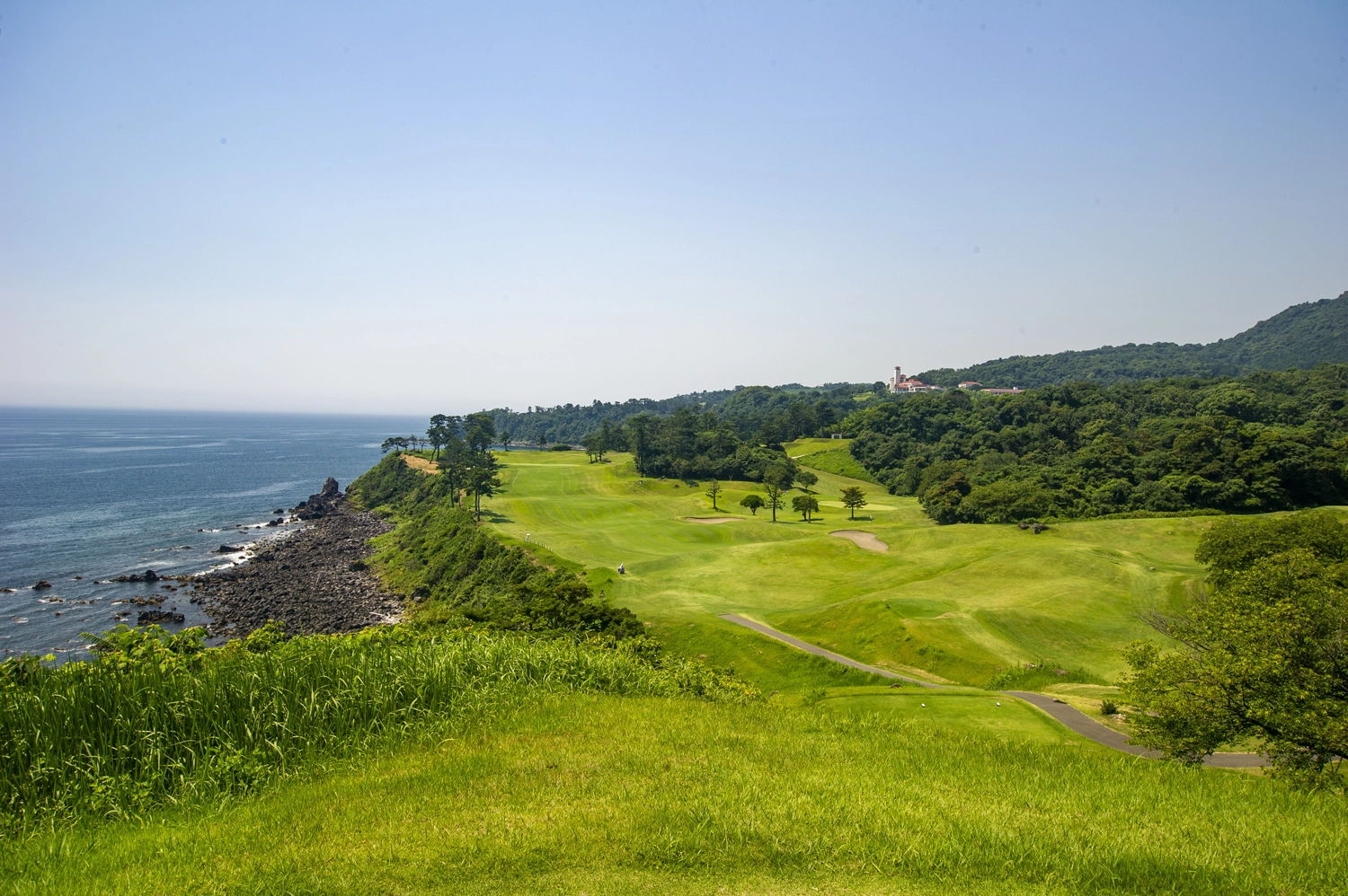 東京からクルマで約2時間、相模灘の一望する景観地・川奈は伊豆半島の東に位置し、古くからリゾート地として人気のエリアです。川奈ホテルゴルフコースは、川奈崎灯台がある荒々しい断崖絶壁の台地に展開し、目の前には太平洋の大海原、富士山や伊豆七島、晴れた日には東京スカイツリーまで望み、息を呑むような絶景に囲まれています。