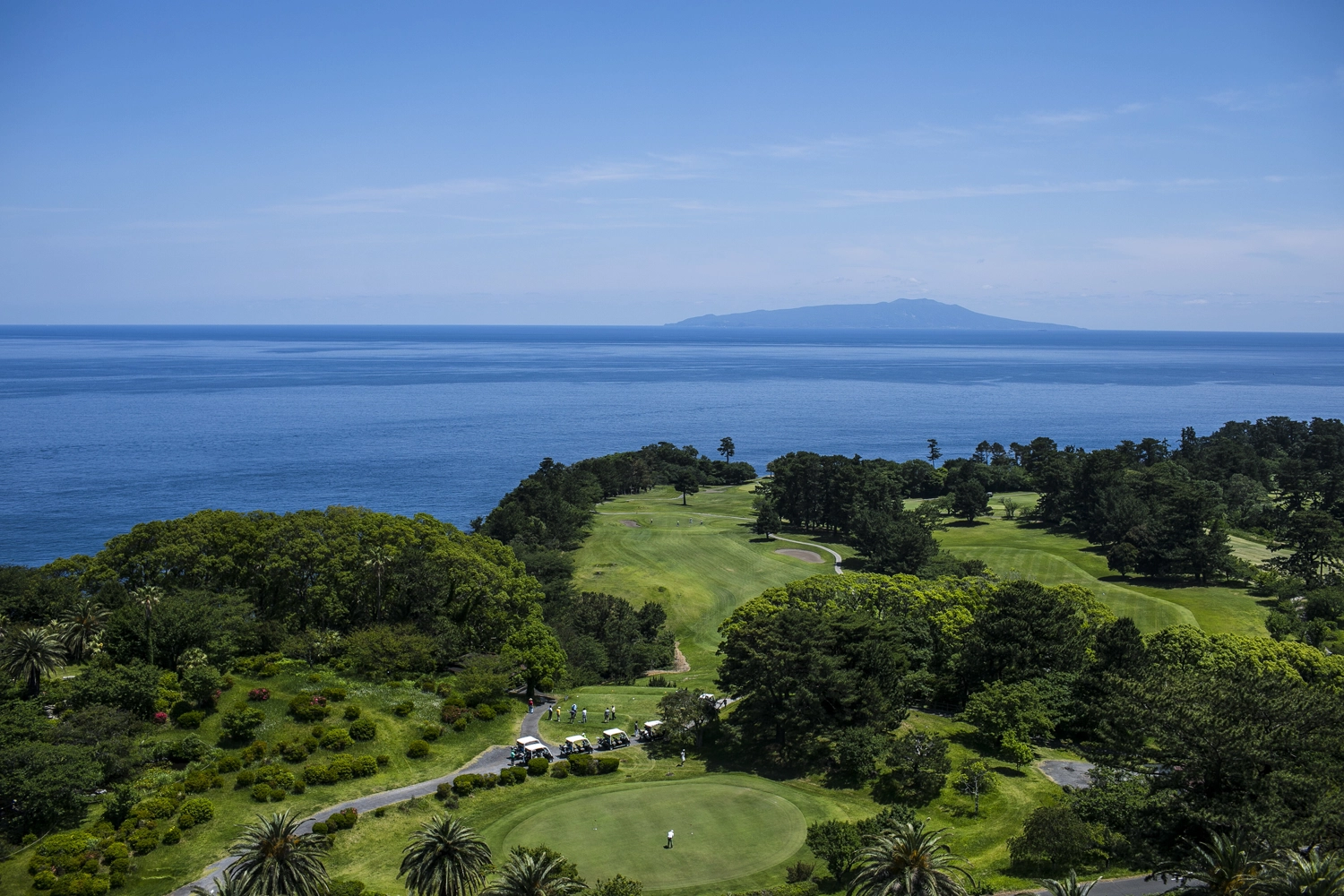 ツアー初日のラウンドは、大島コース。日本ゴルフ協会(JGA)を設立し、日本のゴルフに礎を築いた大谷光明が設計したシーサイドコースです。全長5,711ヤード(パー70)ながら、現代のゴルフギアを使っても容易に攻略できない難しさがあるのは、基本的に戦略性が高いレイアウトだからこそ。スタートホールの1番は、眼前に伊豆大島を望む打ち下ろしのパー4。左サイドに相模灘が広がる4番ホールは別名「Good-Bye」と名付けられ、左に曲げると大きな松に当たるか海に落ちてしまう難関かつ名物ホール。他にも印象的なホールが多く、海を眺めながらスリリングなプレーが楽しめます。