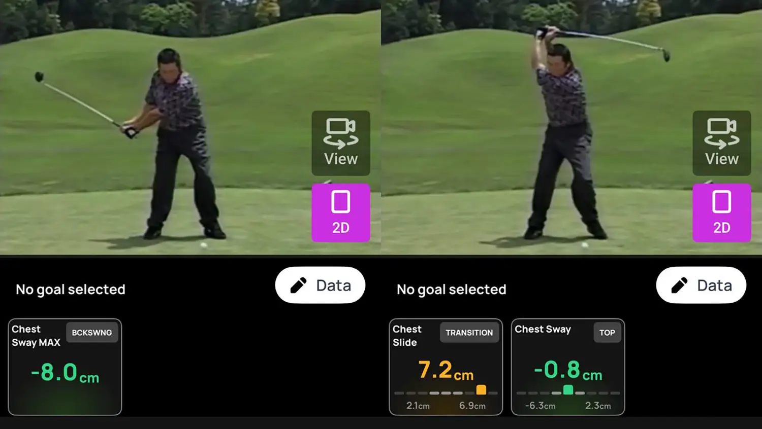 「スポーツボックス AI」が独自で調査した、バックスウィングからトップにかけて胸が右から左に戻る距離の海外男子ツアーレンジ(範囲)は、マイナス2.1センチメートル(右)~マイナス6.9センチメートル(右)ですので、7.2センチメートル左に戻るジャンボは現代の海外男子ツアープロの中でも右から左への横方向の動きが大きいタイプであることがわかります。