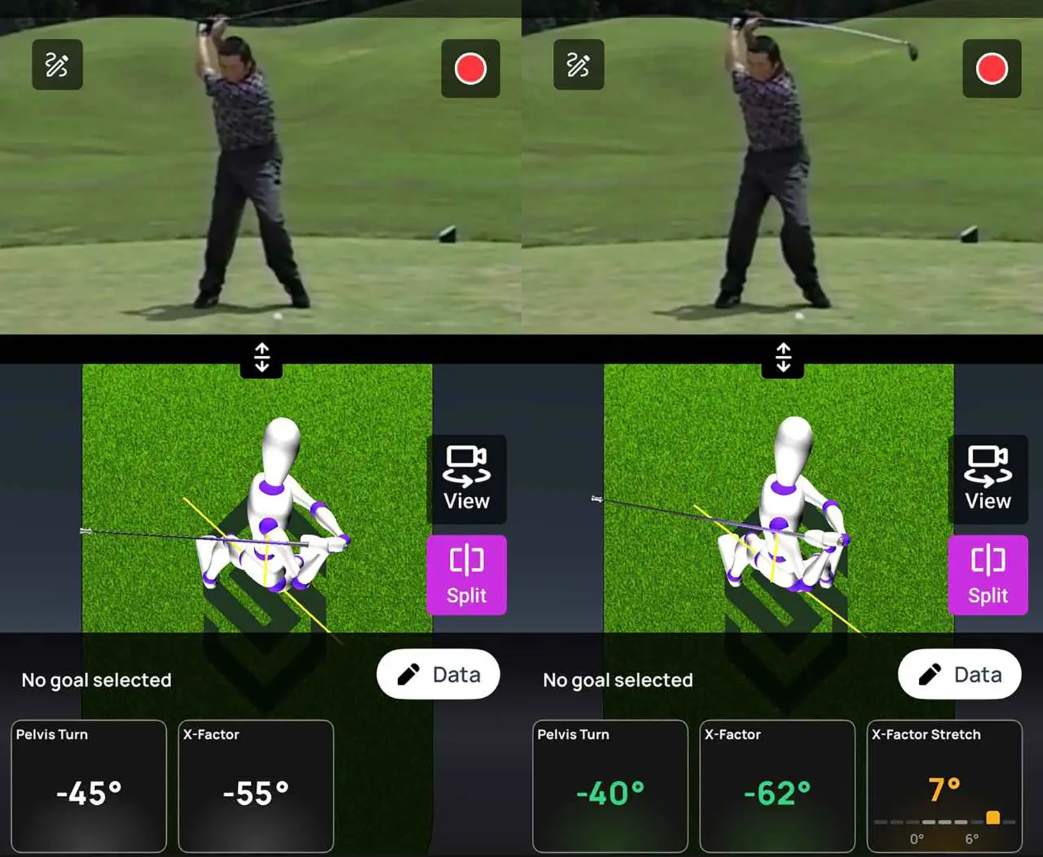 そしてトップでの骨盤の回転角度はマイナス40度で、トップ寸前のマイナス50度と比較すると約5度左に骨盤が戻り始めていて、その結果として捻転差はマイナス55度→マイナス62度と、こちらは約7度増加しています。「スポーツボックス AI」では、このトップ寸前からトップにかけて捻転差が増加する動きを「X-Factor Stretch」(以下、Xファクターストレッチ)というデータで計測しています。