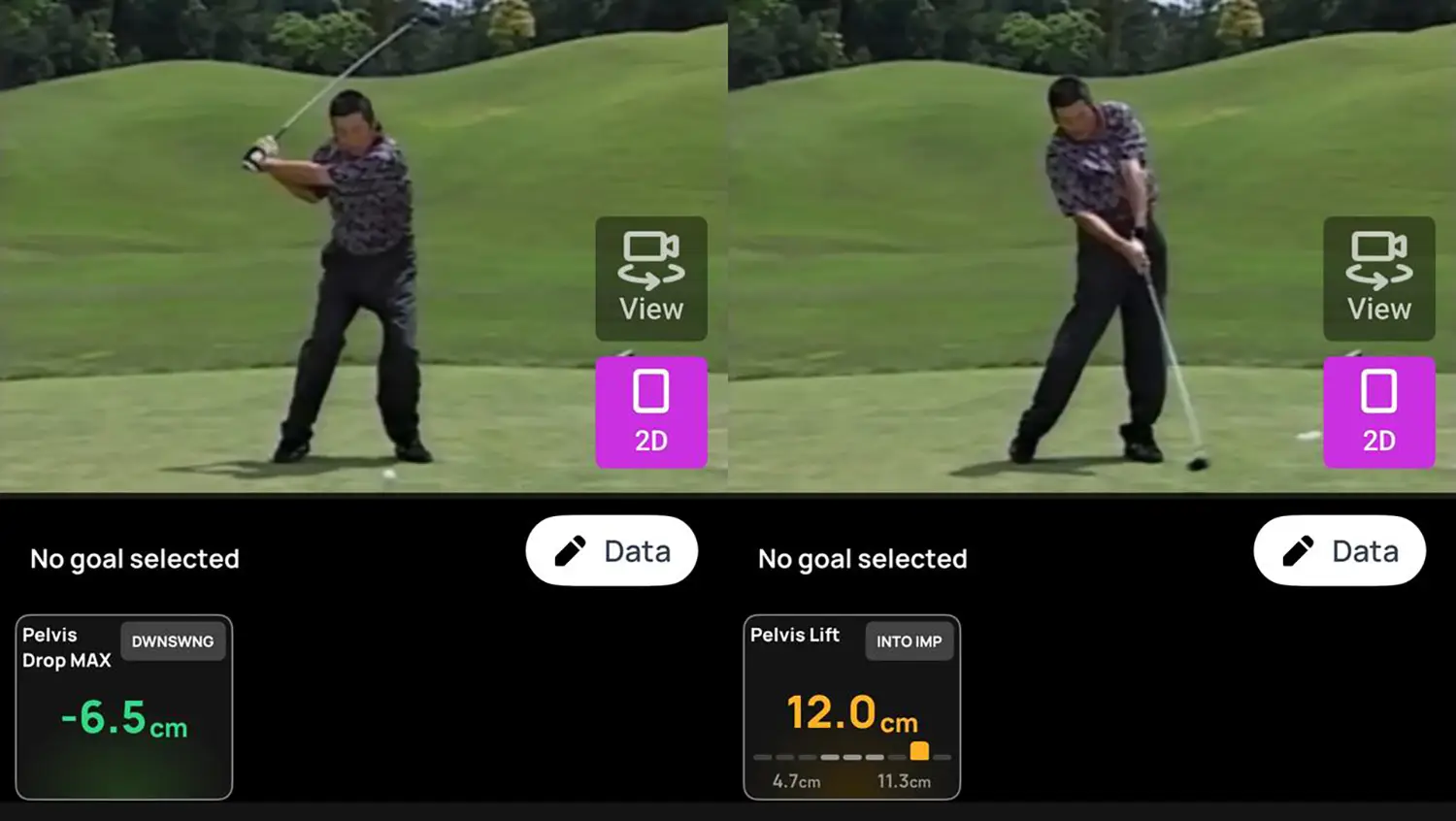 そして、ジャンボの有名な特徴の1つに高いティーアップ(以下、ハイティーアップ)があります。ハイティーアップから繰り出す「高い打ち出し角と低いスピン量」がジャンボの飛距離の秘訣と言われていました。そのハイティーアップと関連するデータは、「骨盤の上下動」です。「Pelvis Lift」は骨盤がアドレスの位置から上下にどれだけ移動したか? の移動距離を表します(マイナスは下へ、プラスは上へ。以下、骨盤の上下動)。ジャンボの骨盤の上下動は、最大でマイナス6.5センチメートル下に沈み込み、インパクトにかけてはプラス12センチメートル上昇しています。中でも注目したいのは、下に沈み込んでからインパクトにかけて12センチメートル上がる点で、このデータが大きいほどバーチカルフォース(縦方向の地面反力)が大きいとされています。