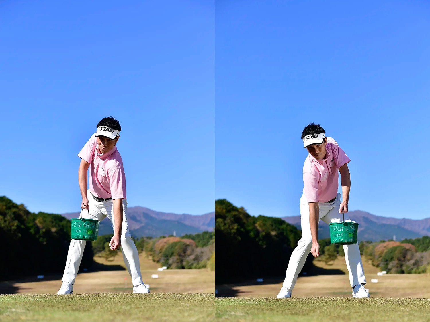 ゴルフは体の回転で打つものと思っている人が多いですが、本理論では「体を回す」「クラブを横(右から左)に振る」といった概念は一切ありません。ポイントは、「腰を切る」「クラブを回す」という2つの動き。バックスウィングで右腰を切り、ダウンからフォローで左腰を切ることで体の中心線がブレず、構えたその場で素早く体を左右に入れ替えることで飛距離を伸ばす、という理論です。