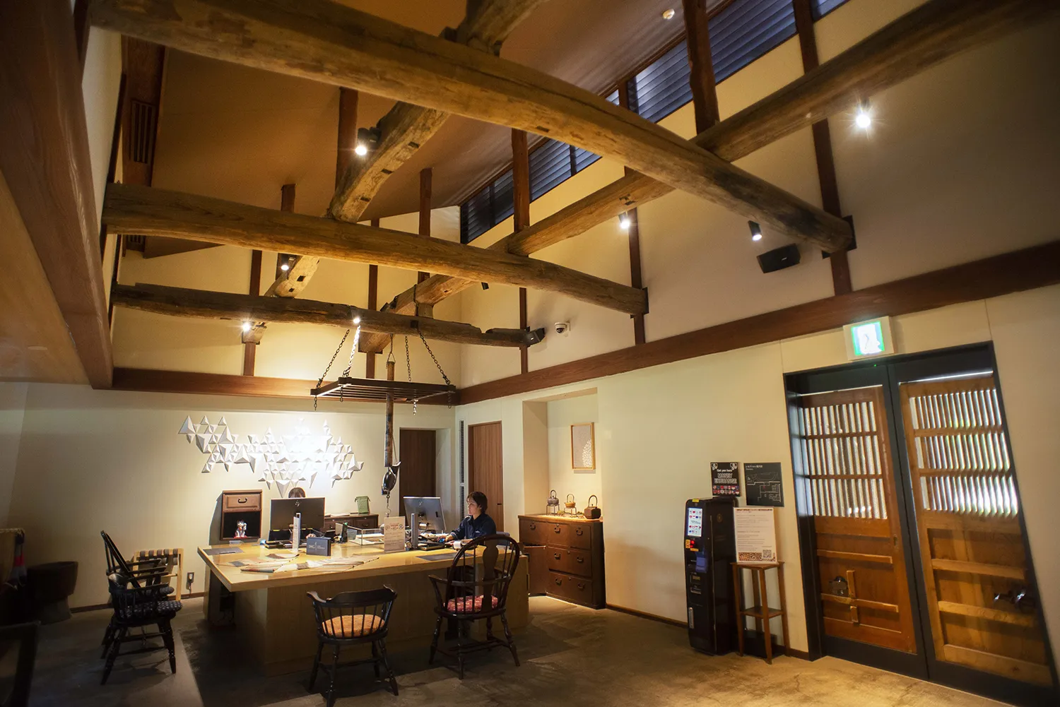 例えばゲストを迎えるロビー。京都の古民家から譲り受けた建具や梁を再利用することで、日本らしい美しさを表現するとともに、空間に温かみをもたらしています。