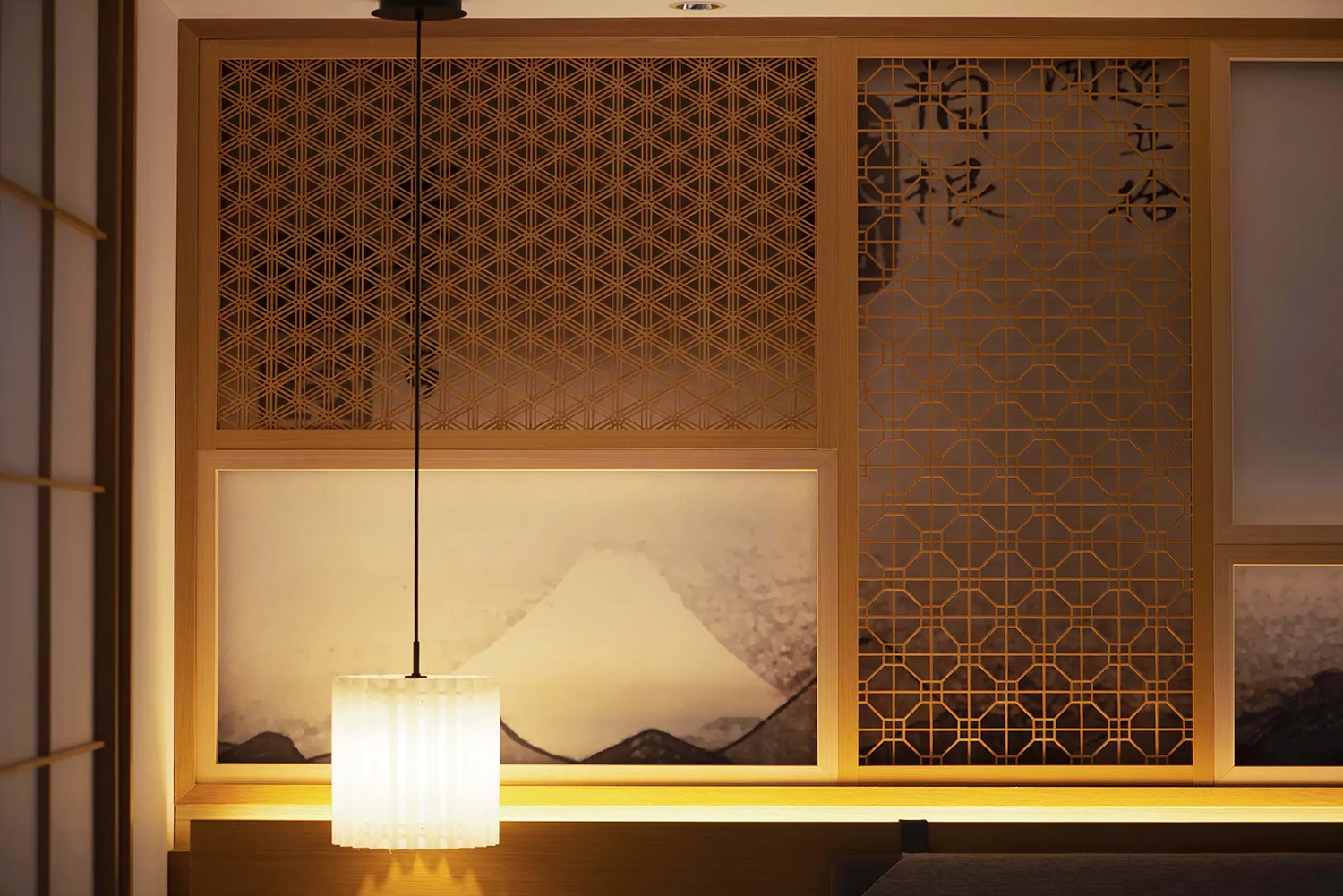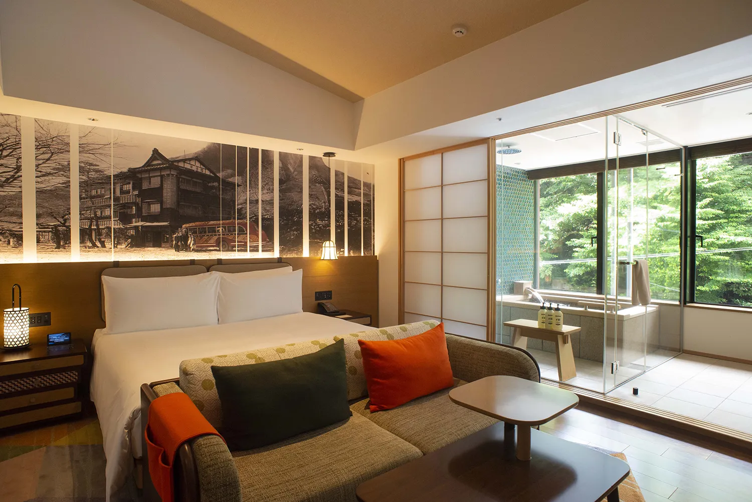 ・地域文化が息づくインテリアと空間。京都の古民家から譲り受けた建具や梁、歌川広重の浮世絵をモチーフにした壁紙や組子細工など、日本の伝統美と現代のモダンデザインが融合。滞在するだけで「強羅らしさ」を感じられる演出が散りばめられている。