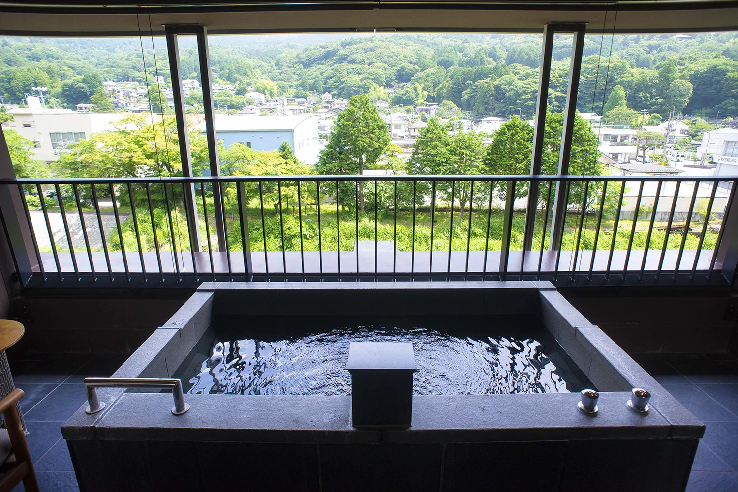 「ホテルインディゴ箱根強羅」が引いている源泉は、強羅温泉のひとつである宮城野温泉。源泉が高温のため加水して各客室に供給されますが、肌あたりが柔らかいお湯はいつまでも入っていたくなるほどの心地よさです。
