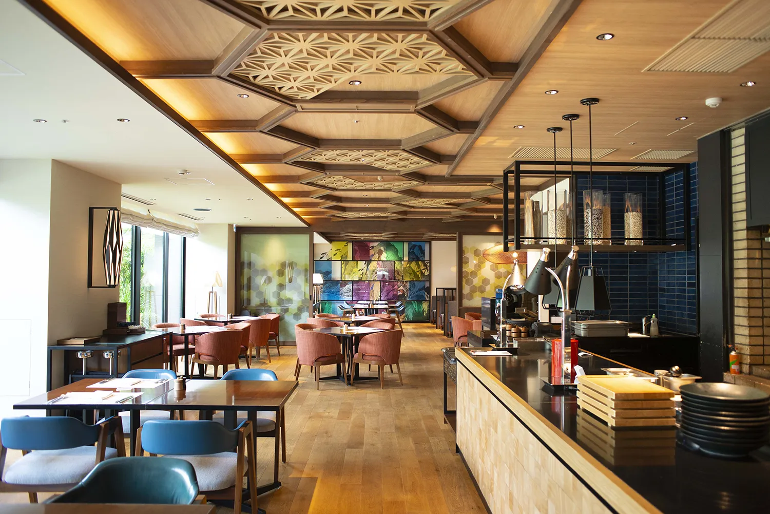 箱根伝統の組子細工を組み合わせた意匠が施された天井と、光あふれる大きな窓が印象的な店内は、リラックス感あふれるムードに満ちています。