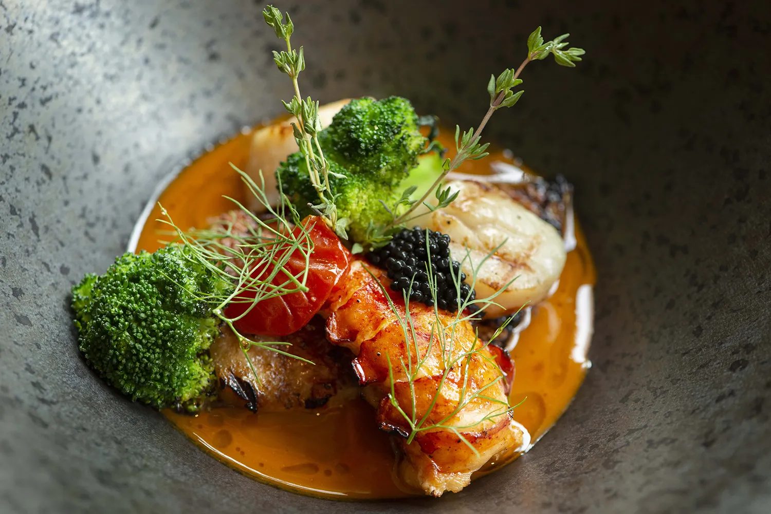 ブイヤベースは、金目鯛、オマールエビ、ホタテなどを一度薪火で焼き上げ、うまみを引き出してからスープに仕立てるというスタイル。