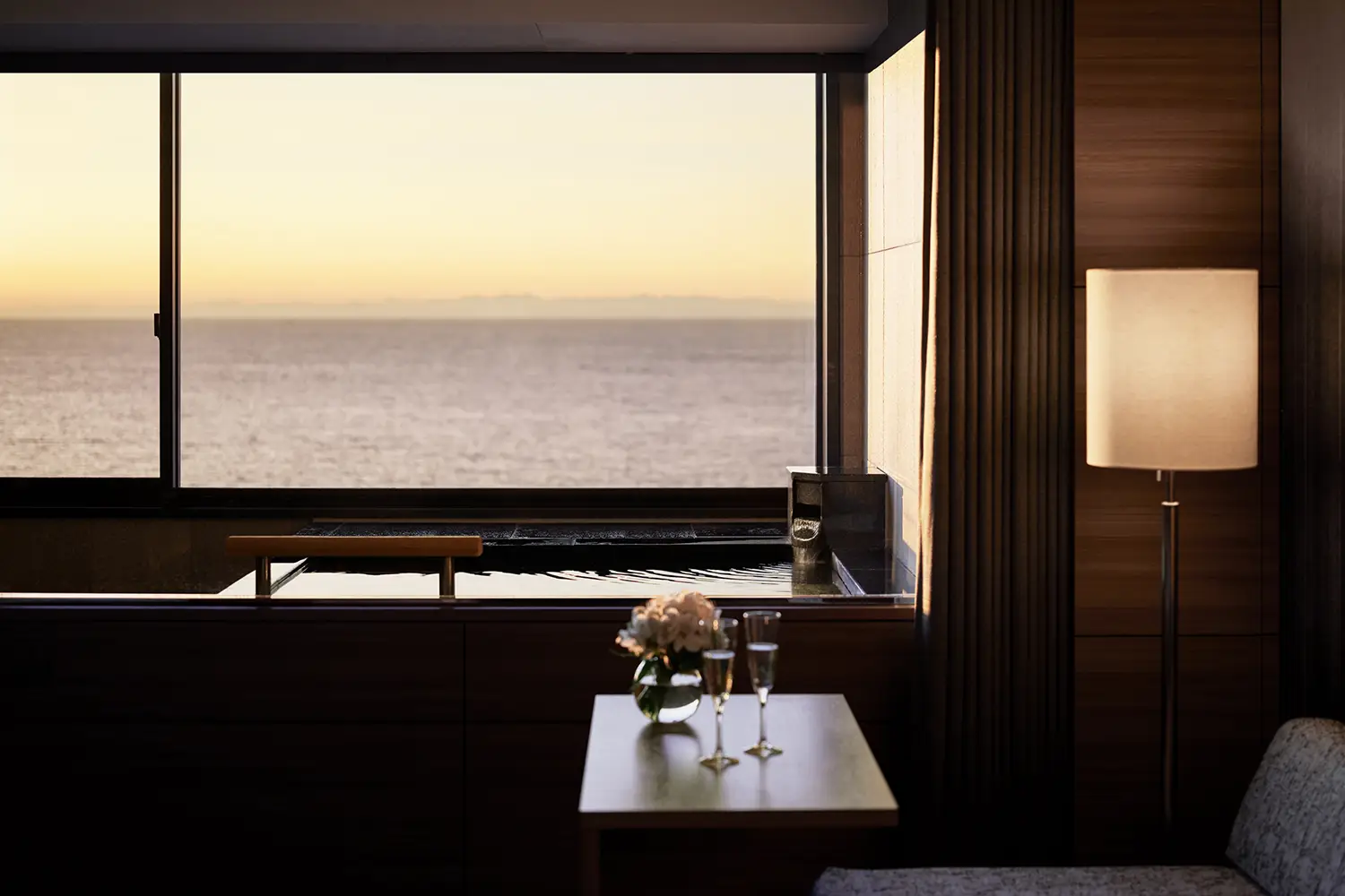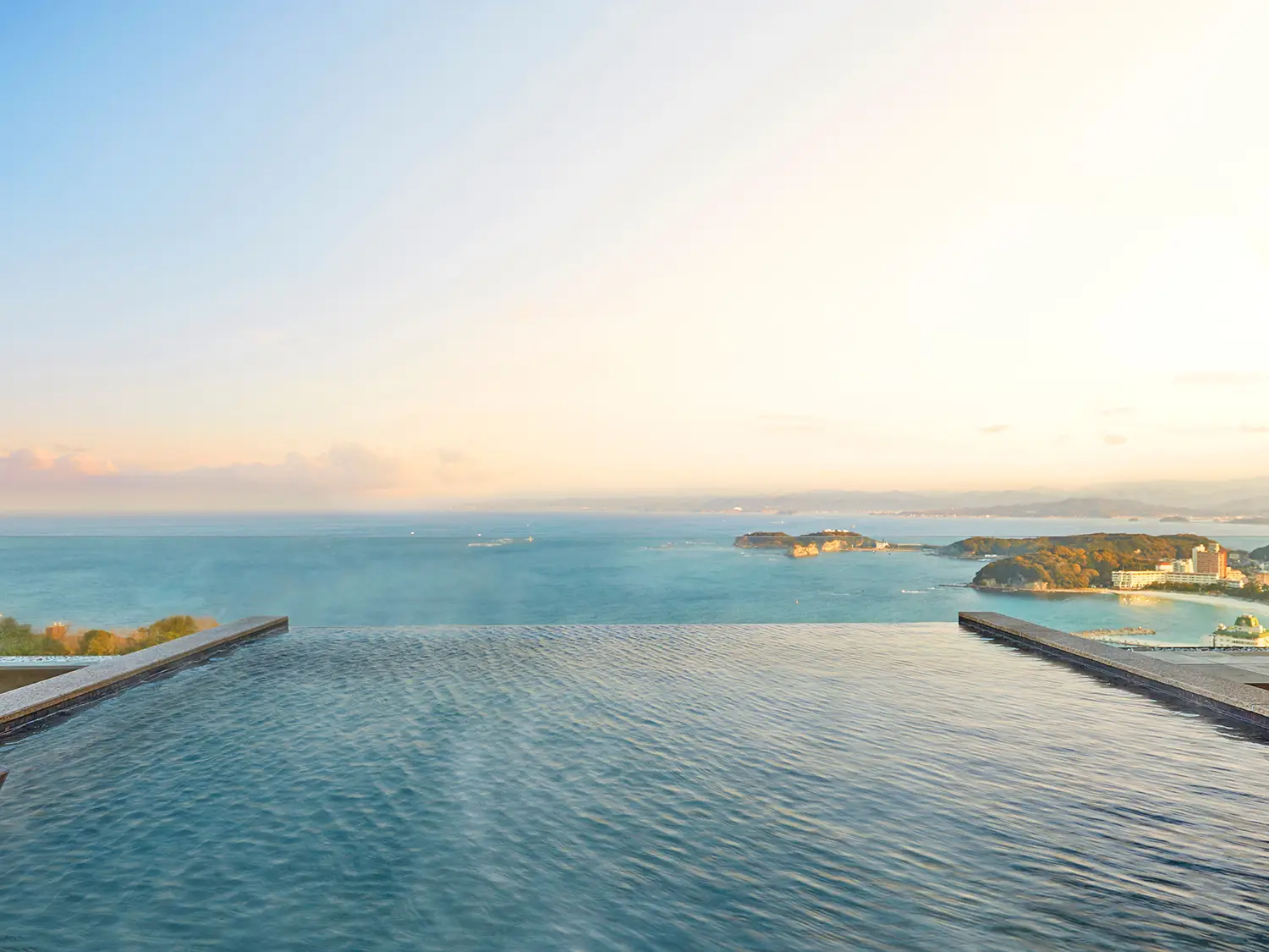 「INFINITO(無限)」。このリゾートはその名のとおり、空と海がどこまでも広がるようなインフィニティ感に満ちています。高台に位置するため、ラウンジや多くの部屋からは白良浜と太平洋を望むことができ、特にインフィニティ露天風呂からの眺望は旅のハイライトとなることでしょう。由緒ある銘湯「行幸(みゆき)の湯」の源泉を引いた温泉は湯量も豊富で、身も心も解きほぐされます。