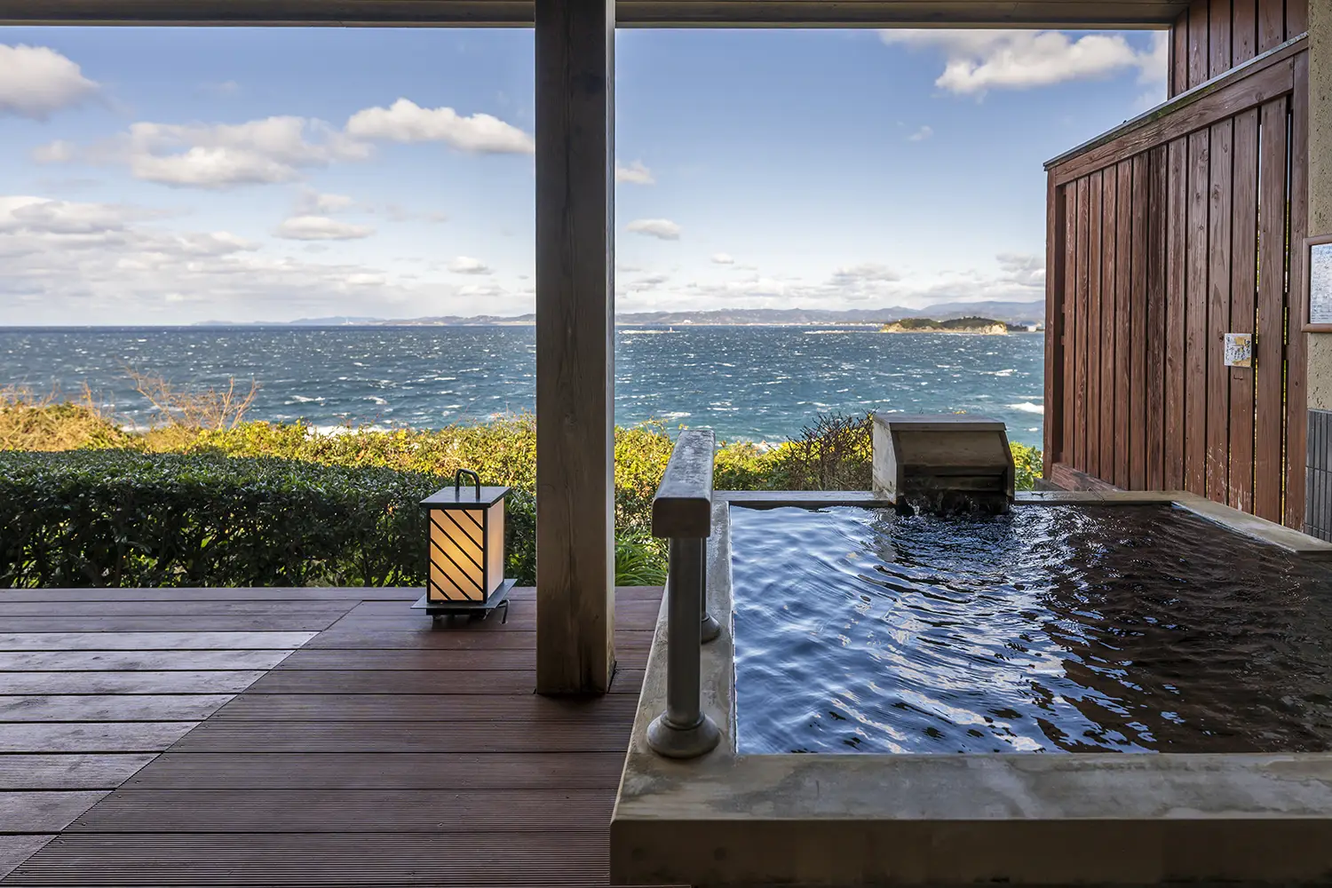 岬の突端に立つ、和の情緒あふれる温泉宿。館内は畳敷きの廊下が続き、まるで旅館とリゾートホテルが融合したような趣のある空間です。特筆すべきは、太平洋を一望できる混浴の露天風呂と、2つの貸切露天風呂。「蘇りの湯」といわれる合気温泉と、「知恵が授かる」といわれる文珠温泉の2種の温泉を、源泉かけ流しで楽しめます。