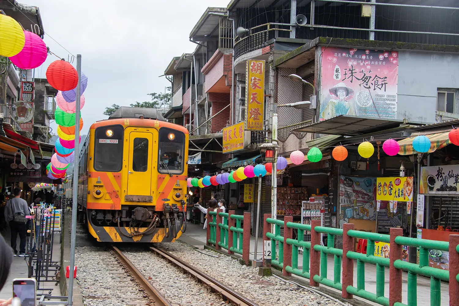 ランタンは通常、平渓線の鉄道線路上から飛ばしますが、この線路を挟んで連なるのが十分老街(シーフェンラオジエ)。線路と店の1メートルほどの隙間を縫って列車が走る光景も、この地ならではの情趣。旅行客はこぞってフォトジェニックな一枚を写真に収めます。