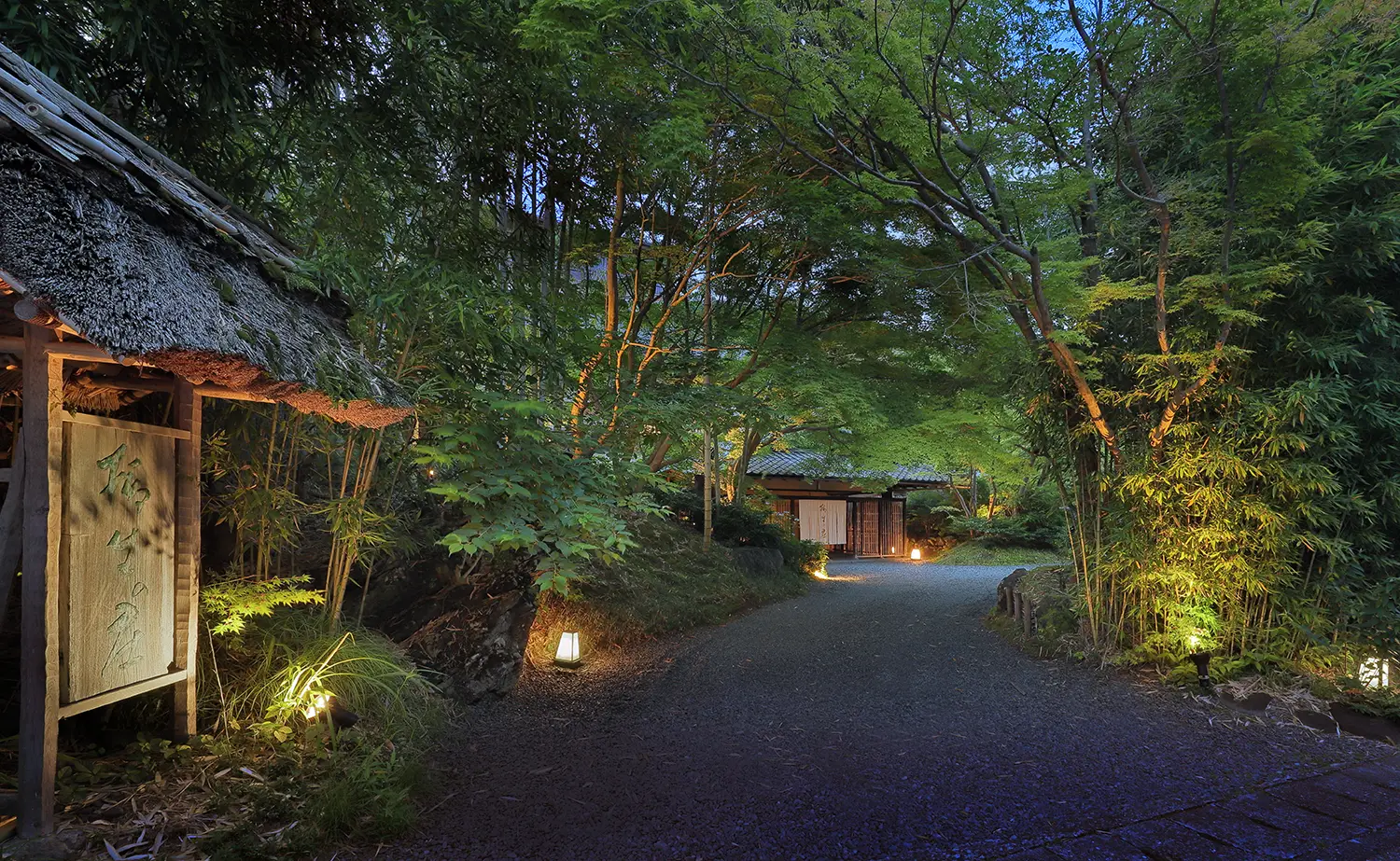 創業40周年を迎えた2009年(平成21年)には、さらなる精進を誓って大規模なリニューアルを決断。開業以来この地で育まれてきた建物の玄関・風呂・各部屋を、職人古来の技を集めた本格的な数寄屋造りに改修しました。瓦屋根の曲線、建具など細部に凝らされた細やかな意匠、そして竹林と調和する外観など茶の湯の精神が息づく建築は、まさに日本の粋を凝縮した芸術品。敷地内に普段とは異なる、ゆるやかな“とき”が流れていることに気づかされるでしょう。
