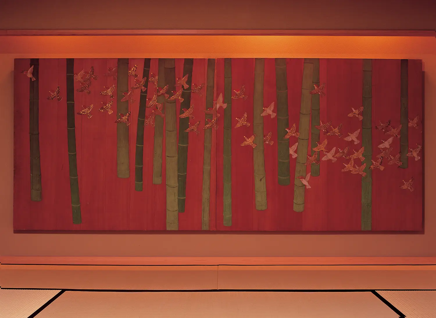 アプローチを抜け、竹のルーバーがあしらわれた玄関の暖簾をくぐった瞬間、ゲストはこの宿が育んできた美意識をいっそう深く体感することになります。正面には見事な時季のしつらえがなされ、そこからロビーへ続く和室には、杉板に描かれた竹林の間を雀が飛び交う三連の大作が飾られています。これは東京の料亭創業時に日本画の大家・堀文子氏に描いてもらったものだそう。そのほか敷き詰められた畳から天井の組子細工、そして随所に配された季節の野花まですべてが呼応し、「温かくやすらぐ、気のかよう宿」という先代の想いを体現しています。