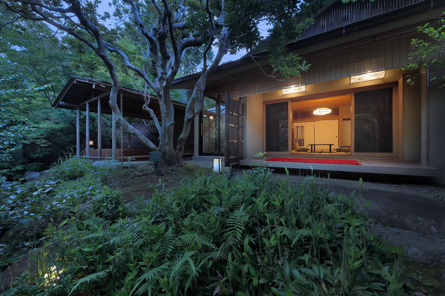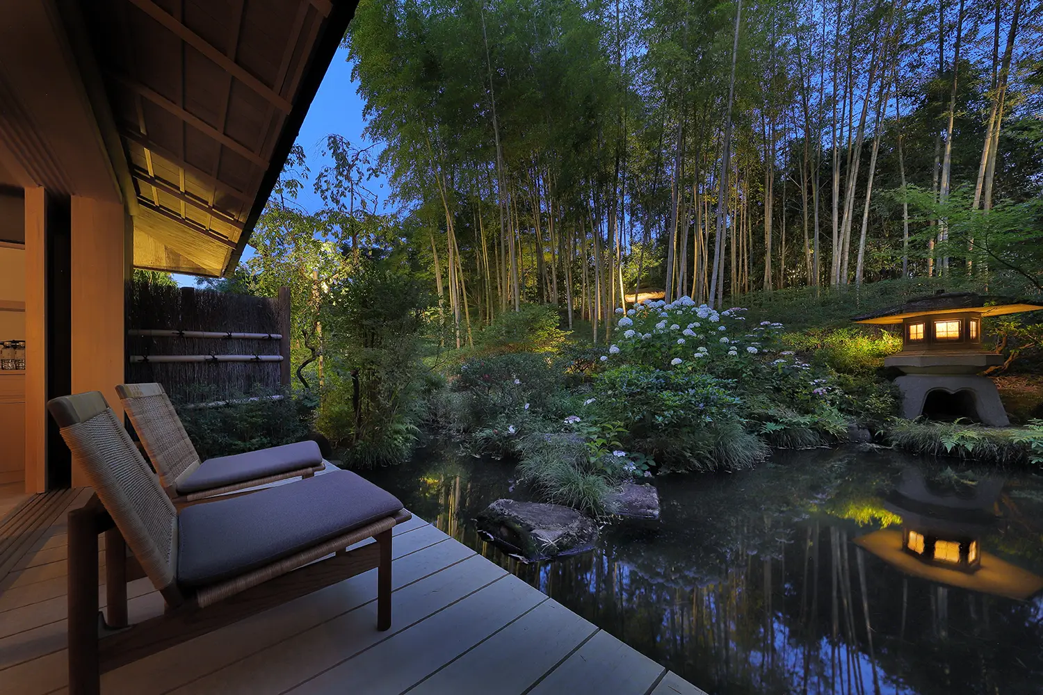 そしてロビーに足を踏み入れると、目に飛び込んでくるのは大きな窓の向こうに広がる庭園。四季折々の表情を見せる里山の自然が、まるで一幅の山水画のように切り取られており、その美しさに息を呑みます。ウェルカムドリンクで喉を潤しながら、しばしの団欒。スタッフの手際よく心のこもった応対に接すると、これから始まる滞在への期待が胸の奥で静かに膨らんでいくのを感じるはずです。