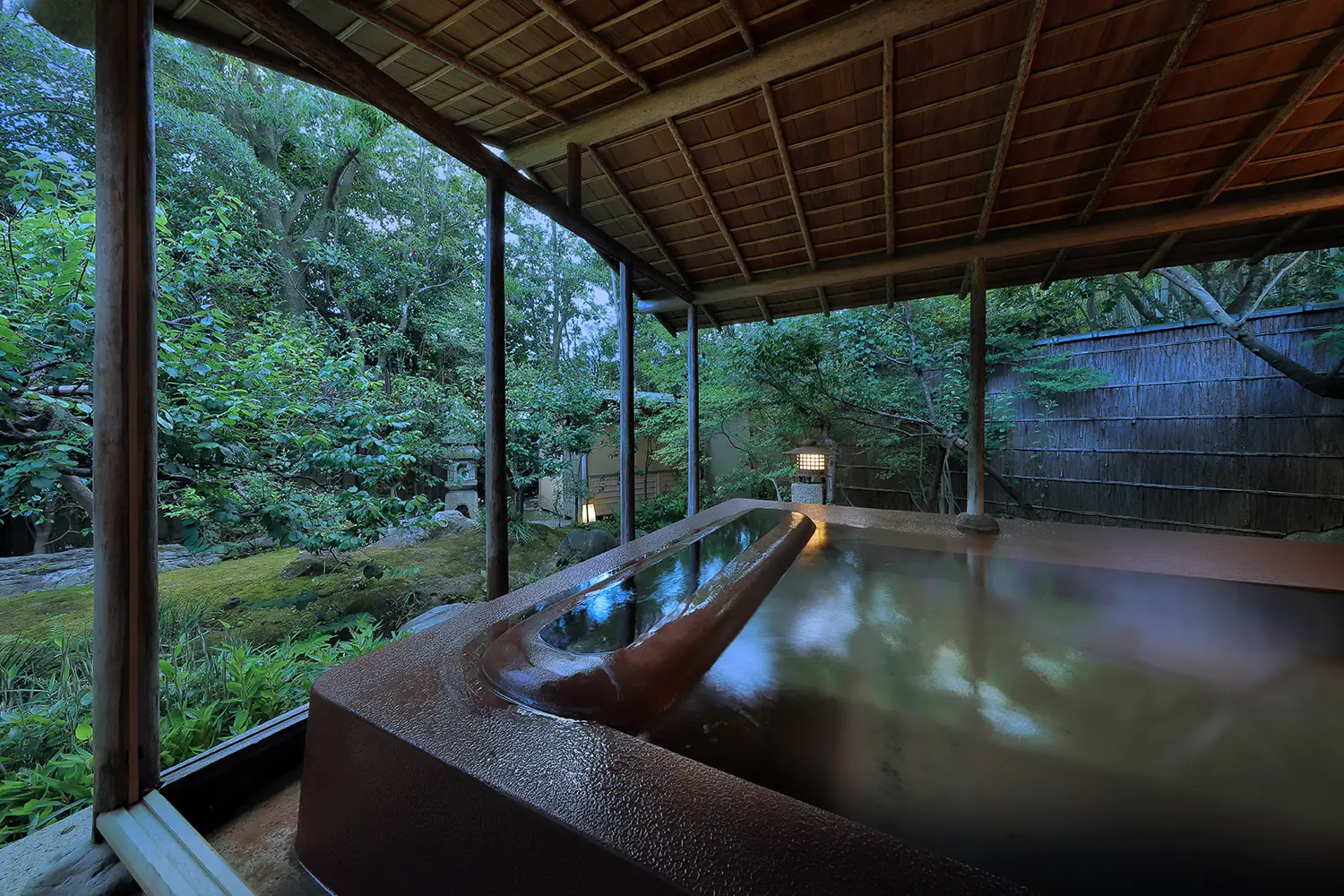 客室は離れの2部屋を含む全15室。数寄屋造りをベースにしながらも各室意匠が異なり、魅力的なバリエーションが揃っています。すべての部屋に源泉かけ流しの露天風呂か半露天風呂、あるいは檜の内風呂が備わり、いつでも心置きなく湯浴みを楽しめるのも、この宿ならではの贅沢です。