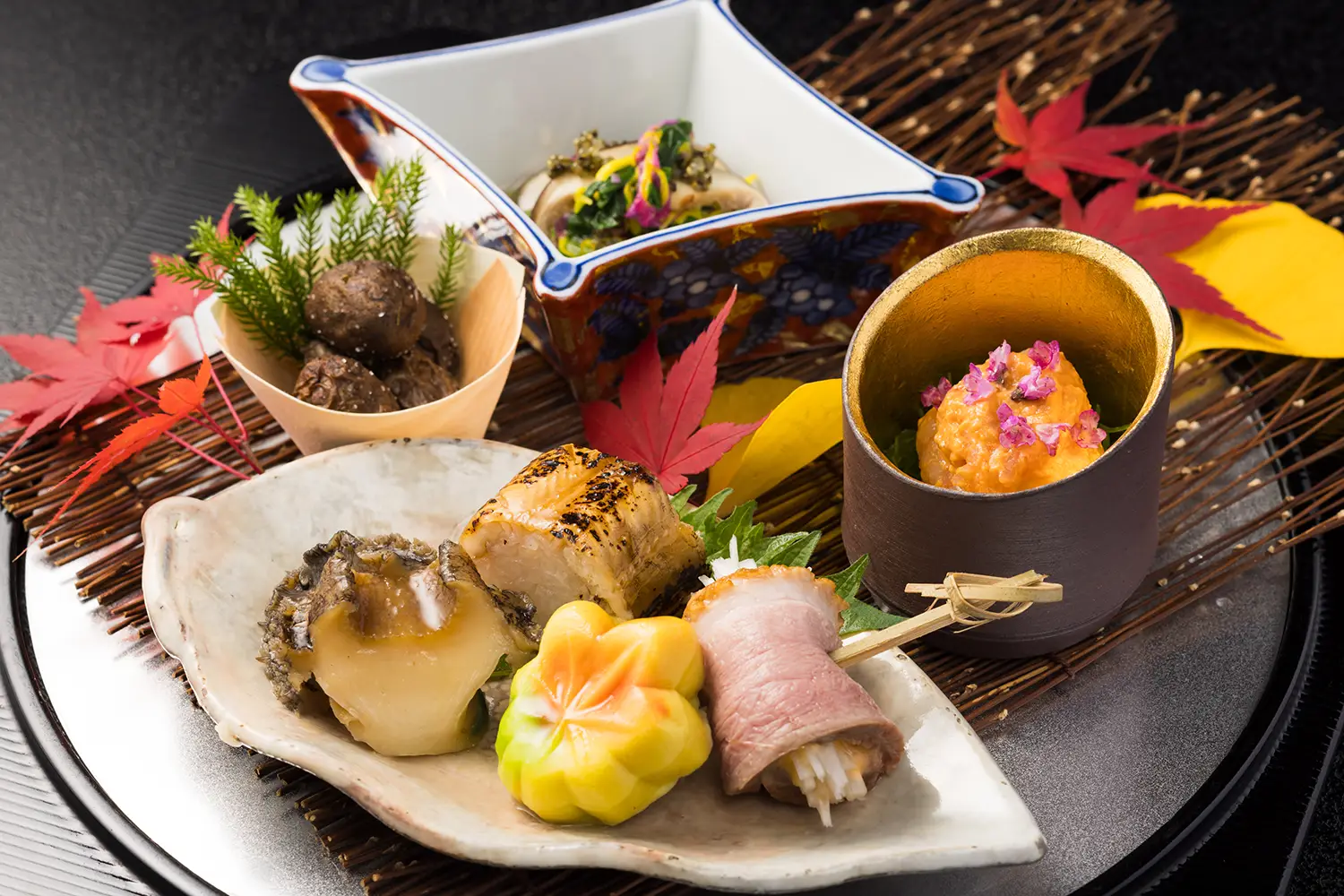 さて滞在のクライマックスといえば、食事。旧・芝白金の料亭「柳生」を起源とすれば、そのクオリティは言うに及ばず。「熱いものは熱く、冷たいものは冷たく — この料理の基本を大切に、地元ならではの食材や旬の食材を取り入れながら、献立に活かしています」。そう語るのは現在の四代目料理長・神田直也氏。京都瓢亭や東京星ヶ丘茶寮という名店の数々で腕を振るった初代をルーツに、先代たちのエッセンスを受け継ぎ、京懐石を礎とした日本料理の真髄を体現。さらに独自の感性でブラッシュアップに挑みつづけています。
