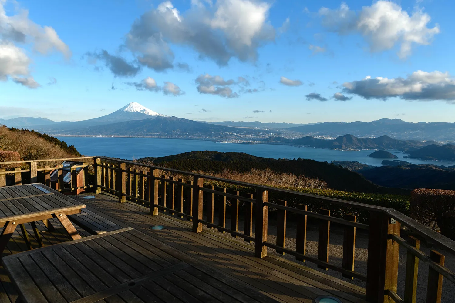 標高約620メートルのレストハウスから眺める駿河湾越しの冠雪富士の眺めと、山間の谷間の斜面に広がる年中緑の宝石を敷き詰めたかのようなわさび田の景観は伊豆屈指の絶景です。心に残る一夜の余韻を胸に、こうした素晴らしいドライブへと繰り出すのもいいでしょう。