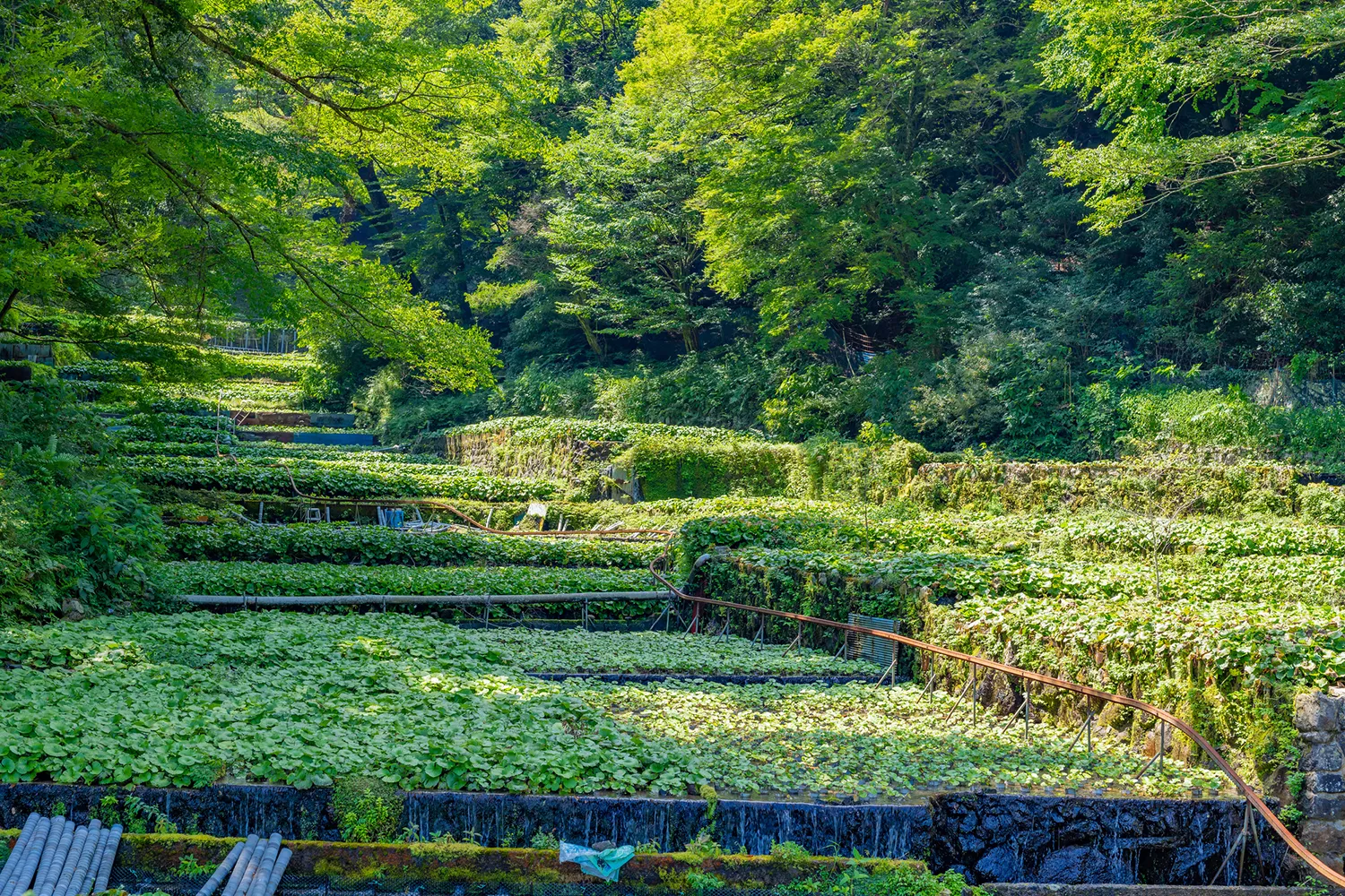 長谷川店主のおすすめは、宿からクルマで約15分の「だるま山高原レストハウス」に立ち寄り、西伊豆スカイラインで開放的な走りを楽しんだあと、大見川の上流部、地元名産の上質なわさびを栽培する筏場〈いかだば〉のわさび田を訪ねるコース。