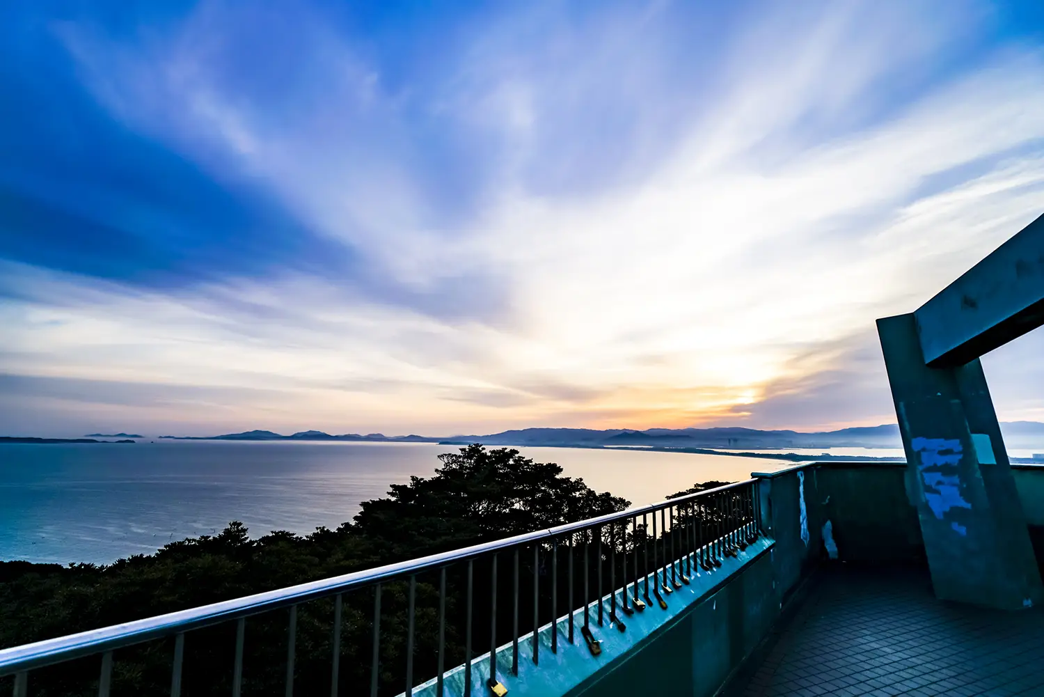 志賀島の中央部、標高約170メートルの高台に位置する展望台。博多湾と玄界灘を一望する360度のパノラマが広がり、水平線から昇る朝日はまさに息をのむ美しさです。島の入り口付近には海の神を祀る志賀海神社があり、初詣と合わせての参拝もおすすめ。島内唯一の天然温泉「金印の湯」でからだを温め、福岡市街地のグルメを楽しむこともできます。