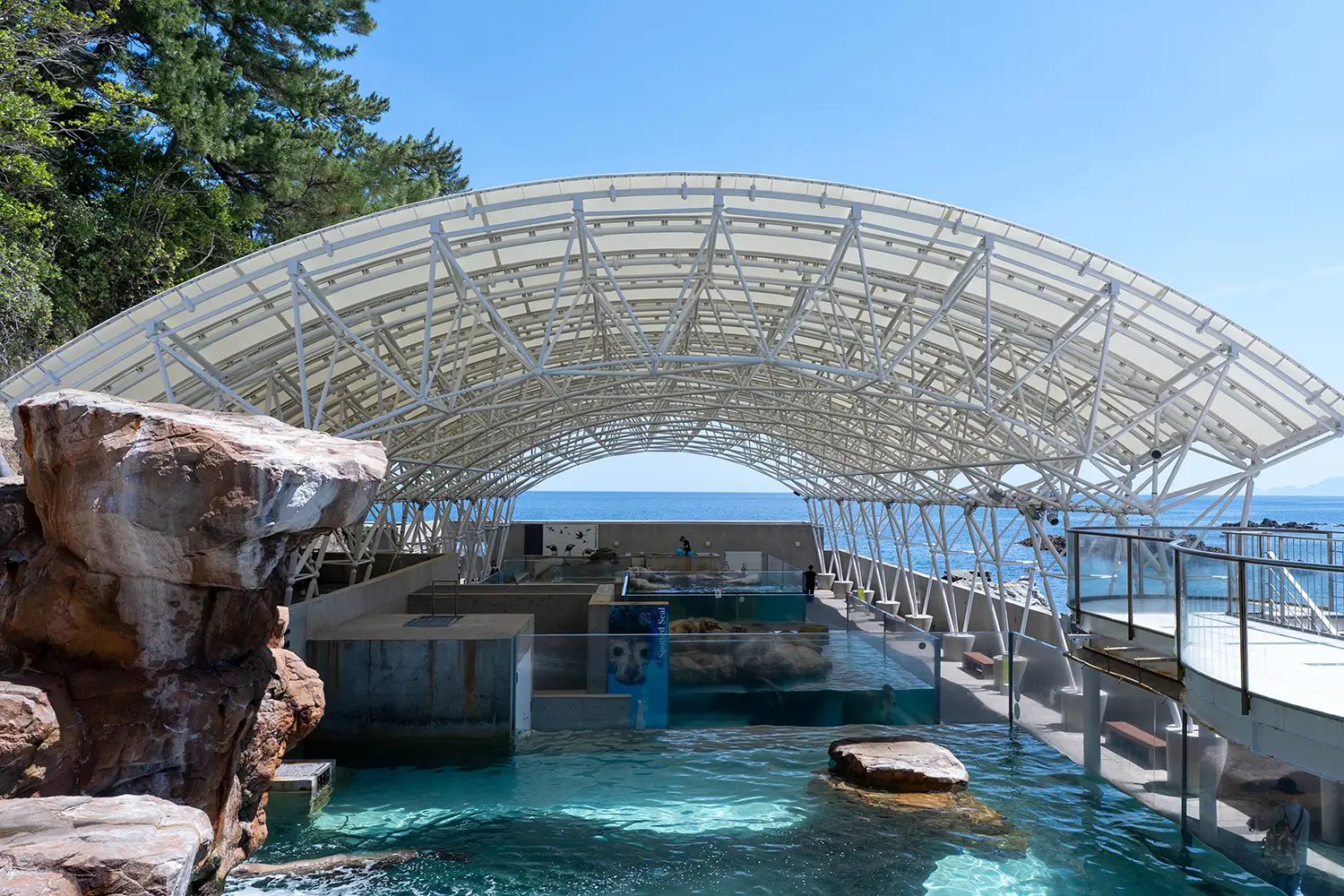 断崖絶壁の日本海を背に、アシカやアザラシが泳ぎ、潜り、鳴く。海と地形を活かした立体的な展示により、まるで“自然の劇場”のような臨場感を味わえるのが城崎マリンワールドです。